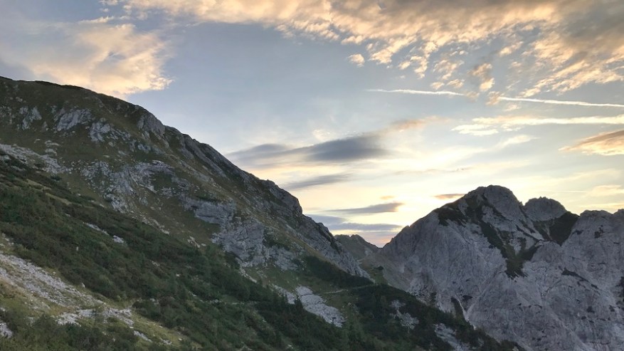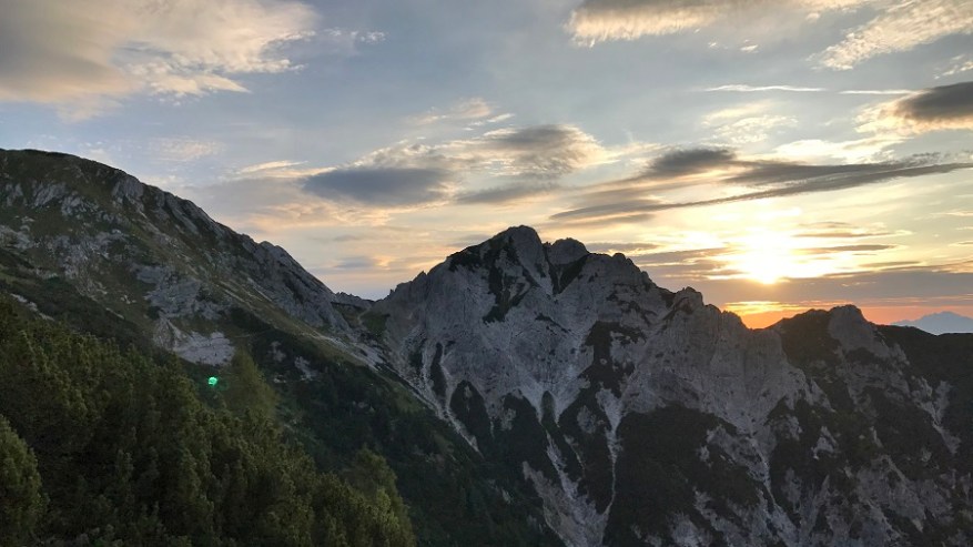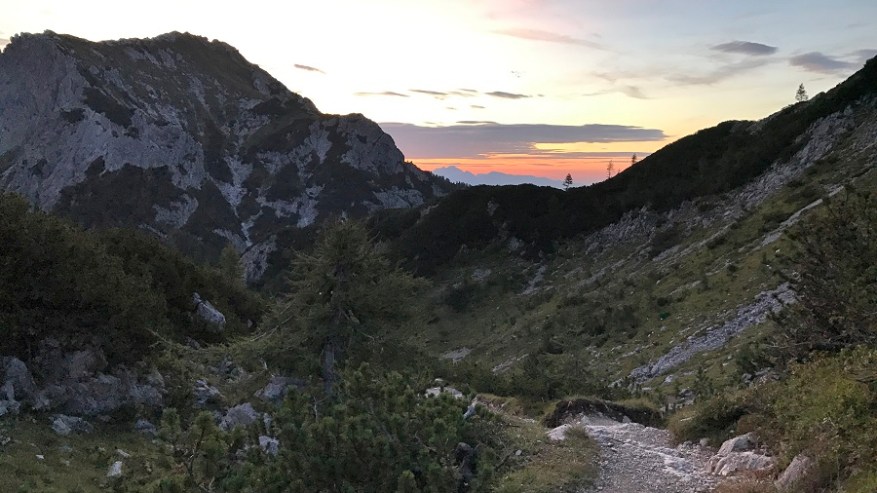 Če sva pred enim mesecem na enaki planinski poti do doma na Planiki začela pri koncu ceste na Pokljuki čez planino Konjščica, sva se tokrat odločila za drugo pot in sicer s parkirišča na Rudnem polju. Na parkirišču so bili le štirje avtomobili, kar je pomenilo, da ne bo prevelike gneče. S parkirišča sva na pot krenila ob 4:40 zjutraj, ko je bila še trda tema. Naglavne svetilke in gremo v gozd. Na nebu je svetilo nešteto zvezdic. Res prekrasen občutek. Pot s Konjšice in Rudnega polja prideta skupaj že tik pod prvim vrhom. Tam je bilo že tako svetlo, da sva lahko ugasnila naglavni svetilki in v daljavi sva že lahko opazovala sončni vzhod. Čez polje po ravnini malce spočijemo noge, nato pa sledi vzpon na Studorski preval.