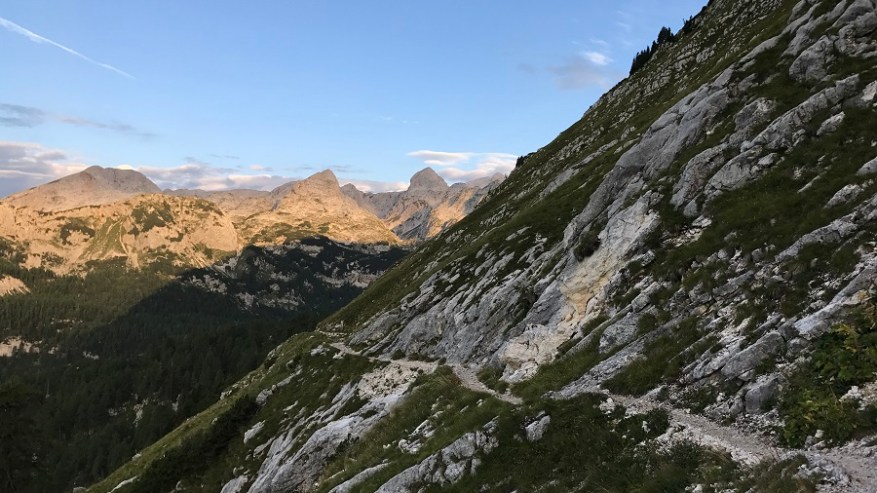 Do Vodnikovega doma sva hodila zelo lepo ob sončnem vzhodu. Pot je večinoma po ravnem, tako da lahko malce spočijete noge. Najbolj nama je bila všeč tišina, saj ni bilo nikjer nikogar. Na celi poti od parkirišča do Vodnikovega doma nisva srečala nikogar. Ne gor ne dol. Res uživaško. Za zadnjimi ovinki pred domom sva že zagledala najin cilj, ki se je lesketal v jutranjih sončnih žarkih. Nazadnje sva bila v megli do Planike, tokrat pa sva videla vse gore in seveda tudi najin cilj. Prekrasno! Na Vodnikovem domu se nisva ustavljala, le dotočila sva si v bidone pitno vodo. Srečala sva 5 planincev, kar naju je zelo veselilo. Srečala pa sva tudi dva gamsa.