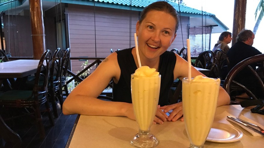 Za sladico sva si največkrat privoščila palačinke s čokolado in banano. Enkrat so nama spekli bananino pecivo ter čisto prave miške. Sicer pa je njihova specialiteta mango lasi – to je mlečni mangov smoothie na indijski način. Hladna pijača se prileže v njihovi neznosni vročini in vlagi. Sveže stisnjene sadne sokove lahko praktično kupite kjerkoli in midva sva si mangovega privoščila na vsakem koraku.