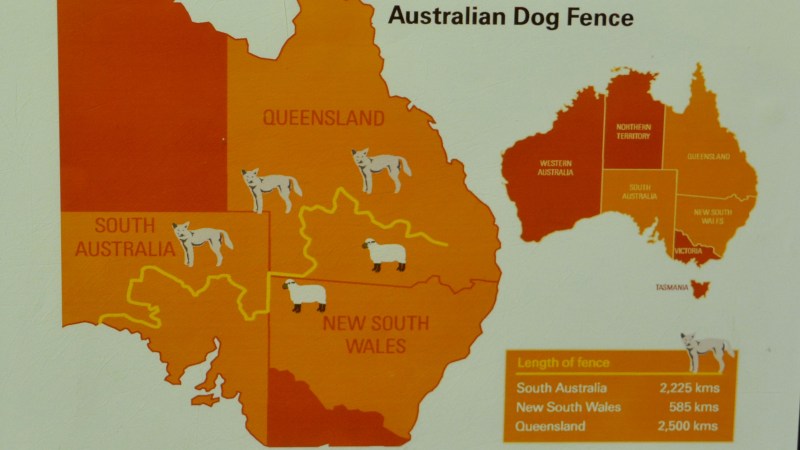 Jutro v Coober Pedyu sva izkoristila še za obisk velike trgovine, nato pa hitro na pot. Čakala naju je več kot 800 km dolga pot v Yularo. V začetnih kilometrih sva lahko še vedno opazovala manjše in večje rudnike opala in same bele krtine ter veliko mehanizacije. Na poti sva prečkala tudi znano zaščitno ograjo “DOG FENCE“. Ograja je namenjena zadrževanju znanih avstralskih divjih psov, ki jih domačini kličejo “dingo“. Ograjo so postavili v letih 1880-1885 in je dolga kar 5.614 km. Ograja pred divjimi psi ščiti mnoga goveda in ovce, ki se prosto pasejo v rodovitni pokrajini juga celine. Je najdaljša ograja na svetu.