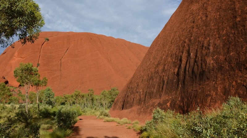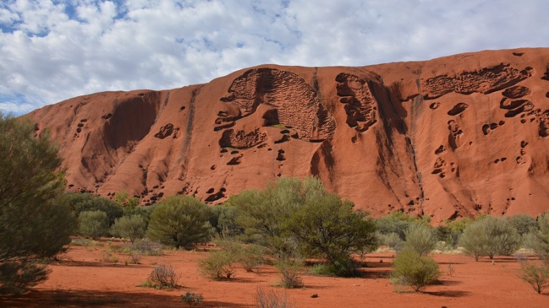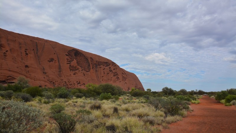 Takoj po sončnem vzhodu sva se odločila za sprehod okoli Uluruja. Za 11 km dolgo pot sva potrebovala slabi dve uri in praktično končala že okrog 9. ure zjutraj. Kljub temu je bilo peklensko. Vročina, muhe in mreža čez obraz. Avtomobil sva parkirala na parkirišču Kuniya in tam začela celoten krog. Moram priznati, da je pri Kuniyi pot zelo zanimiva kakšen kilometer v desno smer, nato je precej dolgočasno vse skupaj. Je pa izjemno lepo, zeleno in čudovite rdeče barve. Uluru je tudi zakladnica vode in znotraj so tolmunčki z vodo. Najlepše so brazde, ki jih je med tisočletji ustvarila deževnica. Sveta gora ima na določenih mestih tudi starodavne poslikave Aboriginov. Narava je tudi izklesala naravne jame, ki so nudile zatočišče domačinom. Ker je Uluru sveti kraj Aboriginov, veljajo znotraj celotnega parka zelo stroga pravila obnašanja. Znotraj nacionalnega parka je cesta, ki pelje do dveh razglednih točk, okoli gore, do kulturnega centra in do nekaj parkirišč ob sveti gori. Na drugih točkah se ne smeš ustavljati z avtomobilom. Dovoljena je le hoja okoli svete gore po lepo označeni poti. Pred nekaj leti je bilo tudi dovoljeno vzpenjanje na sveto goro, a dandanes je le-to prepovedano. Za hojo okoli svete gore se odloči le malo turistov, zato sva lahko uživala v samoti in tišini svete gore.