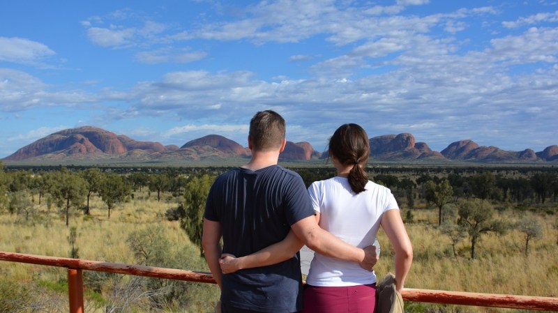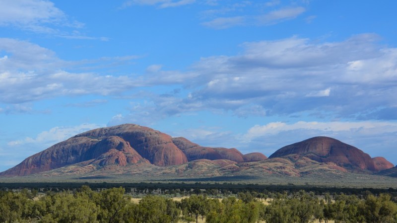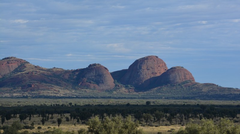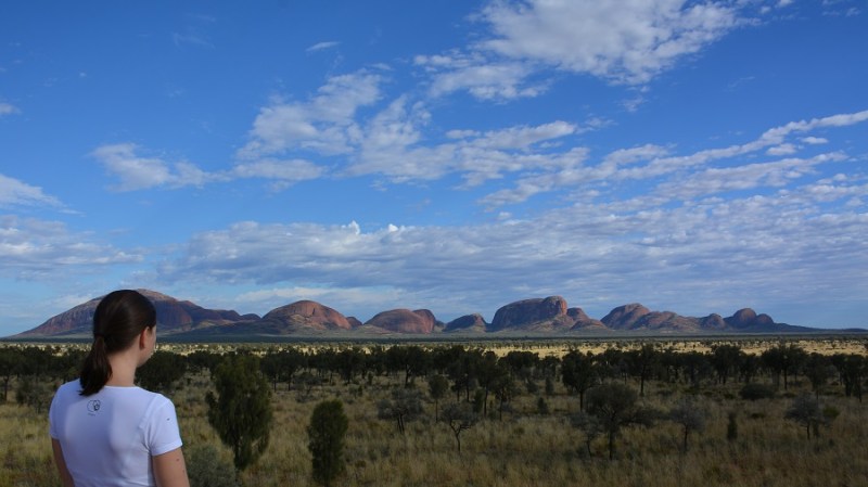 Skupina velikih skalnatih kupolastih osamelcev z imenom Kata Tjuta ali Olgas se nahajajo 27 kilometrov zahodno od Yulare. Ker sva nadaljevala z vožnjo v tej smeri, sva si jih ogledala na poti. Na razgledni točki sva bila pred sončnim vzhodom, tako da je bilo res enkratno. Najprej nama je zelo ponagajala oblačnost, a so se naju nato sončni žarki le usmilili in pokukali izza oblakov. Olge so prav tako del nacionalnega parka Kata Tjuta in predstavljajo svete gore Aboriginov. 36 kupolastih formacij leži na območju velikem 21 km2. Najvišja skalnata formacija je gora Olga, ki je visoka kar 1.066 m. Olge so že na prvi pogled zelo drugačne od Uluruja. Na drugo stran sva lahko opazovala magičen Uluru.