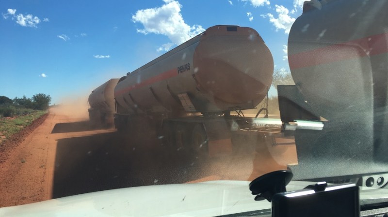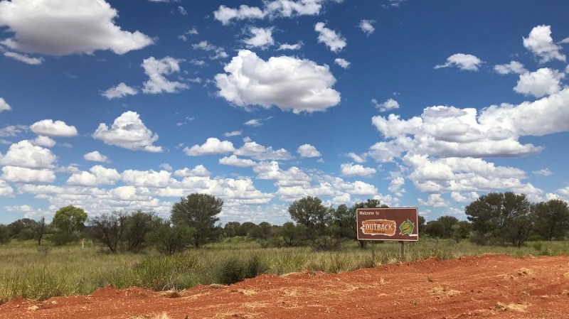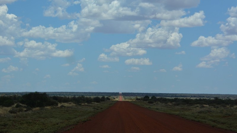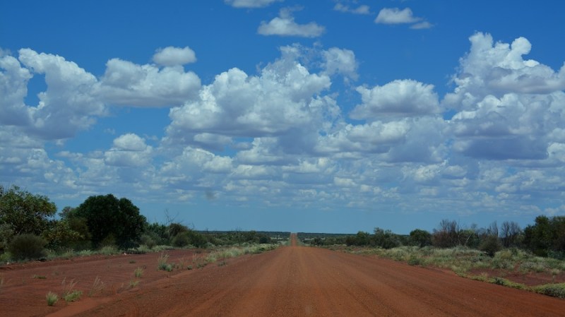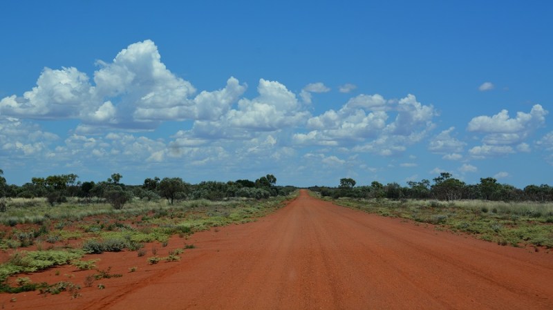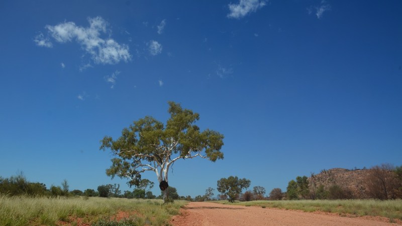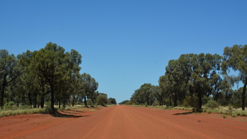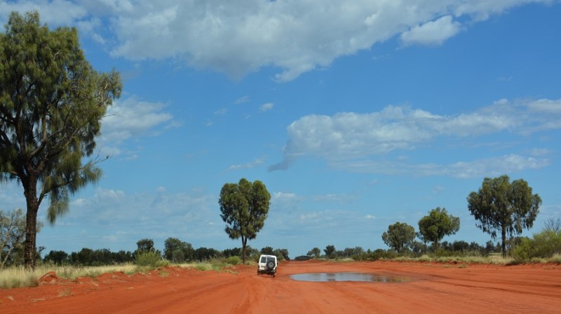 Ko sva se poslovila od Olg, sva se za dolge dni poslovila tudi od asfaltirane ceste. Takoj naju je pričakala tabla “Welcome to Outback” in seveda oznake, da je cesta odprta. A odprta je le za vozila s štirikolesnim pogonom, saj je v celoti makadamska. Great Central Road je makadamska cesta, ki pelje od Yulare do Lavertona na razdalji 1.126 km. Vmes so seveda manjše vasi (t.i. community), kjer živijo Aborigini. Vsakih 350-400 kilometrov je t.i. roadhouse, kjer si dotočite gorivo in je manjša trgovina. Bolj ko ste v odročnih krajih, višje so seveda cene in manj je ponudbe. Cesta je bila večinoma suha, le tu in tam je bila še kakšna luža in blato. Trdota in struktura ceste se je zelo spreminjala, zato je bila pri vožnji večino časa potrebna izjemna previdnost. Presenetila naju je vegetacija. Ne, ni bilo vse puščavsko in suho. Daleč od tega. Osrednja Avstralija je bila praktično ves čas popolnoma ozelenela. Travniki, pašniki, nizko grmičevje in tudi veliko dreves. Visokih dreves. Večino časa je bila cesta lepa, le tu in tam sva zgrmela v kakšnega od velikih jarkov, ki so jih je naredili nalivi. Ja, v osrednji Avstraliji tudi dežuje. Zelo in veliko dežuje, kar predstavlja veliko nevarnost, ki se je takrat še nisva niti zavedala. Prevoziti outback ni za vsakega, je le za izkušene avanturiste z nekaj kilometrine po divjini. Je enkratno doživetje, a vseeno zelo nevarno. Zakaj nevarno? Zaradi odročnosti. Ni signala, ni pomoči, ni ljudi, ni avtomobilov. Če imate prometno nesrečo, vas reši samo klic na pomoč s posebno napravo, ki so nama jo dali ob najemu avtomobila. Sproži se alarm in načeloma vas pridejo rešiti. Izjemno hvaležna, da je bilo pri nama vse v redu. Gre pa lahko hitro kaj narobe, zelo narobe.