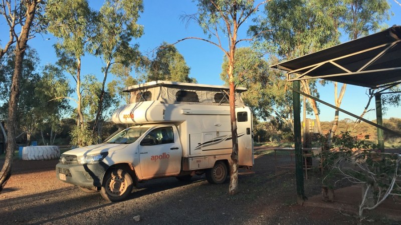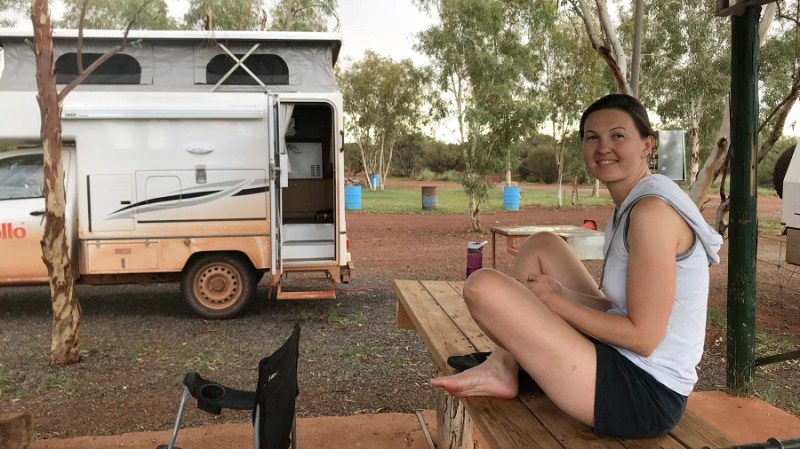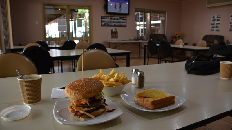 Ker nama je domačin tako prijazno svetoval počitek in ker sva prevozila že 723 km, sva se odločila, da res prespiva tukaj. Uf, midva in nekaj voznikov cestnih vlakov ter nekaj delavcev cestne kontrole. Zvečer se nas je kar nekaj nabralo v res starem in zdelanem kampu. Bilo je pa noro mrčesa, opozorili so naju na kače, kopalnica je bila polna gromozanskih kobilic, iz stranišča in odtokov so lezle žabe. Ojojoj. Še sedela sem raje kar na mizi. In dobila sem lekcijo, da moram nujno nositi zaprte čevlje in ne natikačev, ker kač menda kar gomazi. Velikih in zelo strupenih. Zelo, zelo sem bila kregana. Uf, naslednjič v Avstralijo z najvišjimi gojzarji. Ja, tam jih nosijo čisto vsi. Ampak res vsi – tudi po mestih.