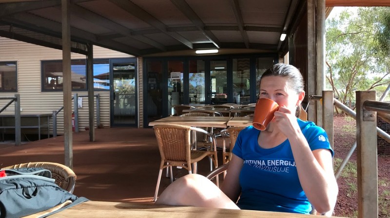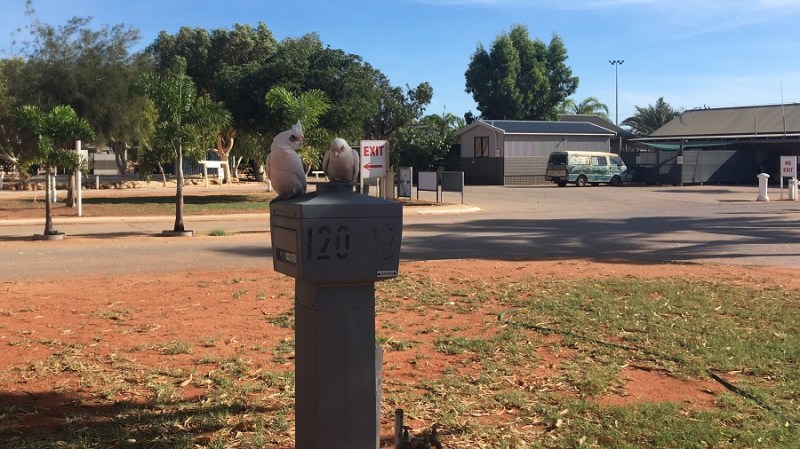 Prevozila sva 675 km, kar je pomenilo prihod v Exmouth malo pred 16. uro. Kamp je bil odprt le še dobre pol ure, zato sva si hitro uredila prostor pod zvezdami. Ker ni sezone, je praktično celo mesto prazno in vsi lokali so zaprti. Delala je le ena picerija in trgovina. Vse ostalo mrtvo in tudi turistov za prste ene roke. Skuhala sva si kosilo v kampu in si malce odpočila ter naredila plan za naslednji dan. Družbo pa so nama delale prav nič sramežljive bele papige in emuji, ki so se sprehajali po kampu. Zakon.