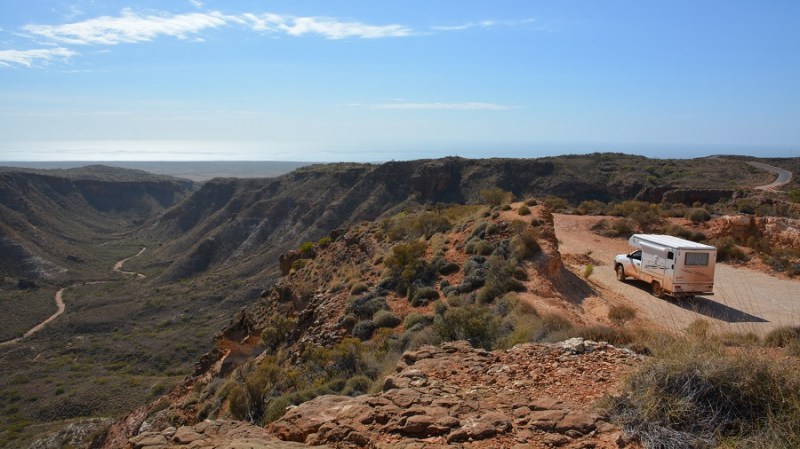 Zjutraj sva spakirala in se odpeljala na najvišjo točko polotoka Exmouth v nacionalni park Cape Range. Ker ni bilo nikjer žive duše, cesta na trenutke precej strma in makadamska, sva se kar malce čudila. Ustavila sva se na nekaj razglednih točkah na poti. Med drugim sva našla tudi razgledno točko na kanjon Charlesa Knifa, ki je res nekaj posebnega. Čudoviti prizori narave.