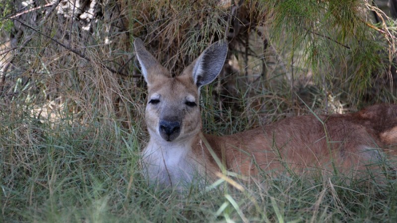 Vožnja do Coral Baya je bila dokaj hitra in prijetna. Tja sva prišla še pred kosilom in se čudila majhnosti zaliva ter celega mesta. Kašno mesto! Dva kampa, dve majhni restavraciji (ki delata izmenično), ena trgovina in nekaj agencij za prodajo turističnih izletov. Hm, to je to! Ampak, ko sva zagledala najin kamp ob plaži, ki je imel celo drevesa in palme, sva se nasmejala do ušes. Hitro sva našla svoj košček raja v kampu in se parkirala za 4 dni. Tukaj nama je pa res všeč. Hitro na kosilo, čaj in kavica, ter na plažo. Ooooo, to pa je plaža. Sicer ponovno nobene infrastrukture na plaži, razen njihovih 10 senčnikov, kar je popolnoma zadoščalo številu turistov. Za grmom še luškan kenguru na plaži za piko na i. Sicer pa plaža majhna, a kot iz pravljice. Ni slučaj, da se imenuje koralni zaliv. Ja, korale in z njimi pisane ribice so v zalivu, kar pomeni snorklanje s plaže in to res noro snorklanje. Zaliv je tudi povsem miren, kar je pomeni povsem varno kopanje in snorlanje. Coral Bay je še vedno del Ningaloo Marine Parka in v celoti pod Unescovo zaščito. Vse vrste rib, pisane korale in čisto morje. Rajsko in sanjsko!