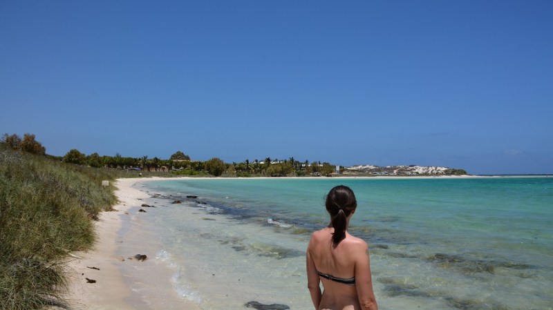 V Ningaloo Marine Parku in na polotoku Exmouth sva pred potovanjem načrtovala daljši postanek. Po slikah in opisih sodeč sva hotela preživeti vsaj 4 dni na tem mestu, raziskovati plaže in se kopati. Bilo je rajsko in sanjsko, plaže so čudovite, morje krasno, a manjkale so nama senčne palme in veliko preveč je bilo vetra. Priznam, da sva malce pobegnila naprej in upala, da bo v rajskem zalivu Coral Bay bolje. Manjkalo nama je tudi malo več civilizacije. Vsaj kakšen lokal in sladoled. Zjutraj sva se najprej odpravila še na najvišji vrh polotoka, od koder je lep razgled na kanjon Charlesa Knifa. Res čudovito! Nato pa naprej do zaliva Coral Bay, kjer je ena najlepših plaž v Avstraliji. Z velikim pričakovanjem sva se pripeljala v zaliv in zagledala palme in senco v kampu. Plaža? To je vse, kar potrebujeva.