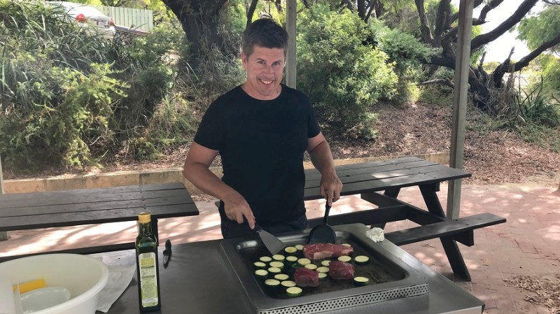 Pozno popoldan sva si privoščila kosilo. V kampu sva si spekla kos zorjene govedine, ki sva ga kupila v marketu. Oh, tako dobrega mesa pa še nisem jedla v življenju. Verjetno se lahko kosa z japonskim steakom Hida, ki sva si ga privoščila pred leti. Njam, njam. Zelo pogrešam v Sloveniji.