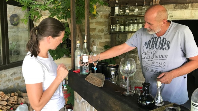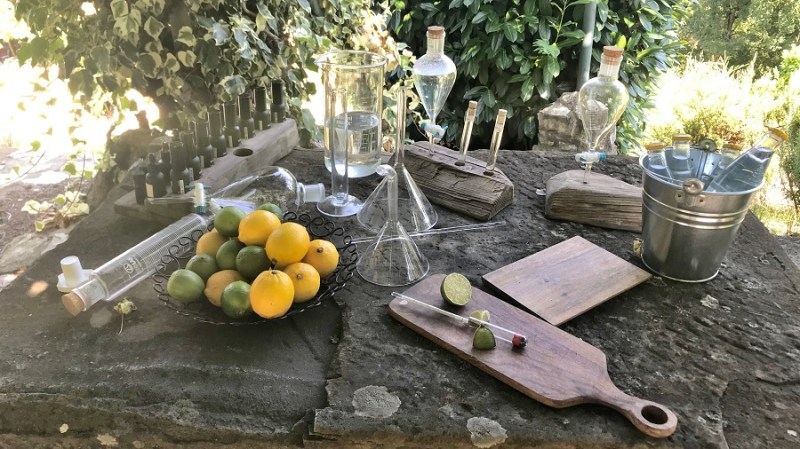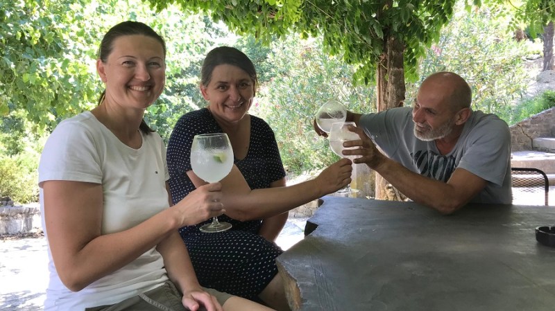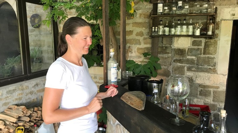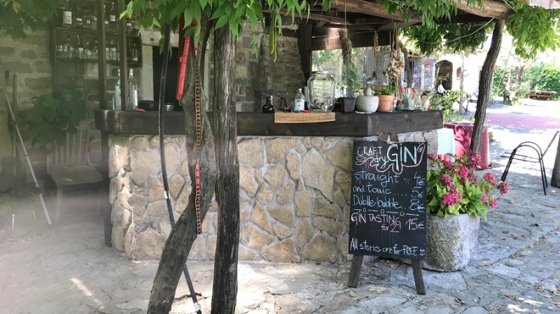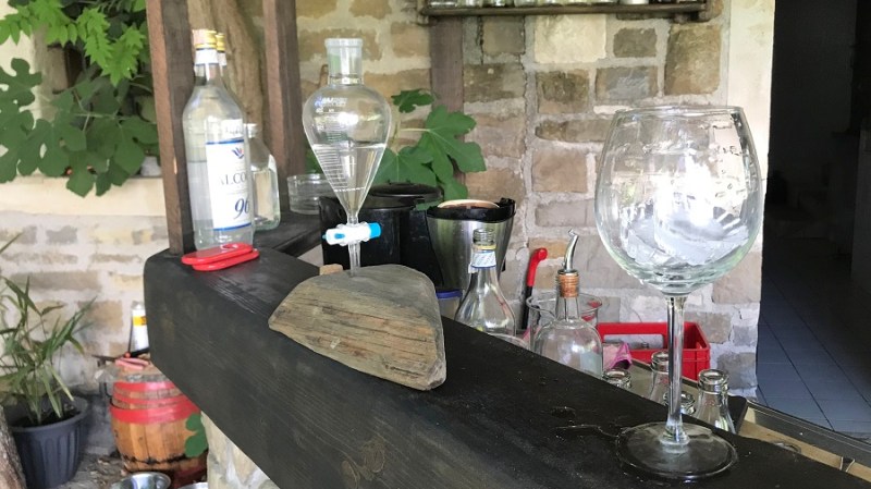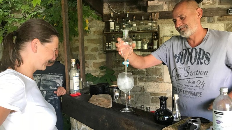 Da ne bo izgledalo, kot da sem huda ljubiteljica alkohola in da delam reklamo. To je umetnost, ki jo moram deliti z vami, čeprav je tudi mene povsem presenetila. Ne pijem alkohola, piva sploh ne, žganice še manj, popijem pa kozarec dobrega vina ob odličnem kosilu. Nekajkrat na leto. To je to. Gin pa je bil splošno med fuj in fej, ker sem v rani mladosti mami enkrat pomolila jezik v kozarec gina s tonikom in od takrat je bil seveda “bljak”. Pred nekaj dnevi pa greva na obisk k Jani in Mateju in nama seveda Jana takoj nameša gin s tonikom. Ne tistega iz trgovine, ampak ga nameša iz svojih doma pripravljenih sestavin. Pred nekaj meseci sta se namreč začela ukvarjati z destiliranjem sestavin gina. Gre za postopek destilacije zelišč, pri katerem pa namesto vode uporabita alkohol, se pravi alkoholno paro. Vsak gin je sestavljen iz poljubnega števila destiliranih zelišč, ki vam po okusu najbolj odgovarjajo. Hm, torej si lahko namešamo povsem svojo mešanico gina, ki nam najbolj odgovarja. Odlično! Več seveda izveste in se naučite na njunih delavnicah, ki jih organizirata na svoji turistični kmetiji in tudi na posameznih lokacijah po Sloveniji. Prvega nam je tako namešala Jana in bil je osvežilen, lahek, poletni gin s tonikom. Uau!