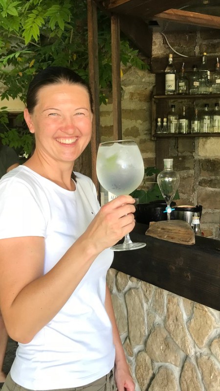 Smisel celotne zgodbe pa je mešanje svojega idealnega okusa gina. Drugega sem si torej namešala sama. Matej me je seveda vodil in naredila sva mešanico, ki je pustila izjemen okus na nebu. Še vedno osvežilen, poleten, a drugačen. Mešala sva sestavine (različne hidrolate) v mililitre natančno, nato pa prelila gin čez kocke ledu in dodala tonic ter košček limete. Moj gin “Dublle Bubble” kot ga imenujeta je bil popoln. Z drugim ginom sem tudi zaključila, a komaj čakam, da si bom lahko kupila njihove sestavine in si svoj popoln gin tu in tam pripravila sama doma in ga popila na svoji terasi.