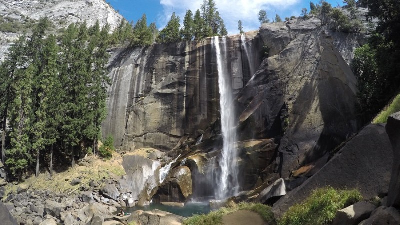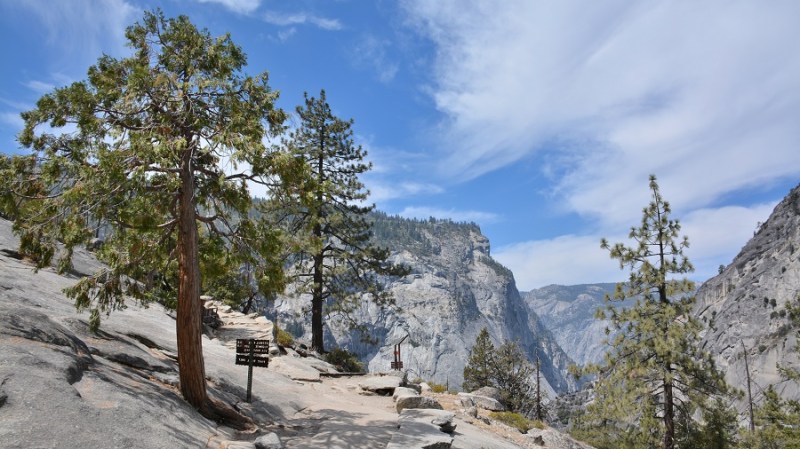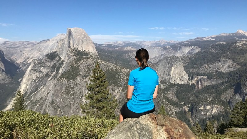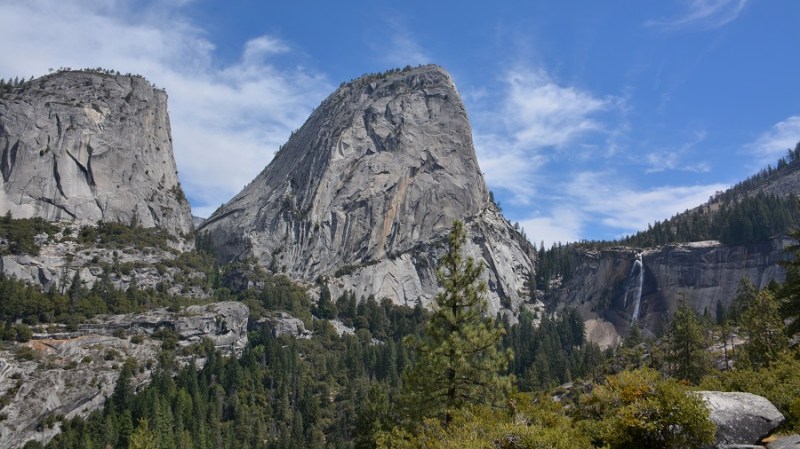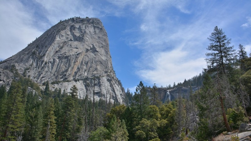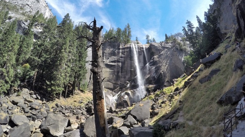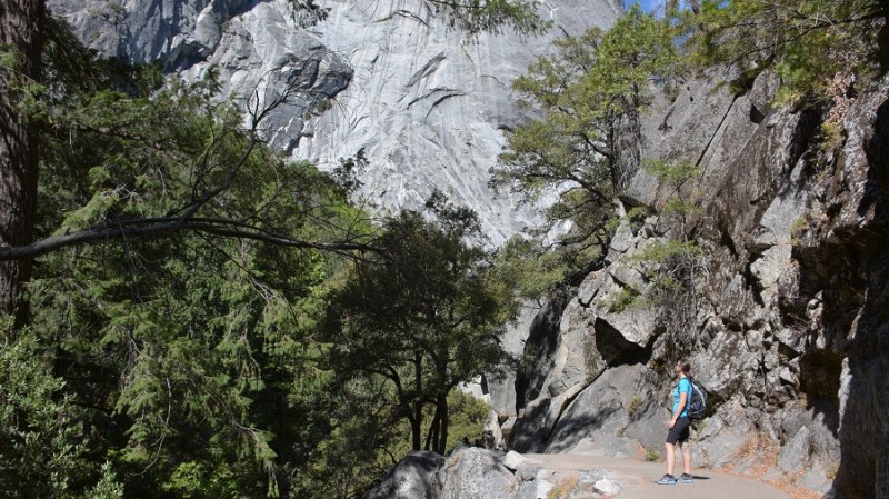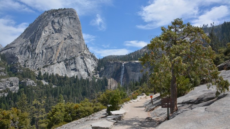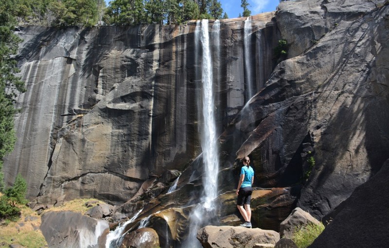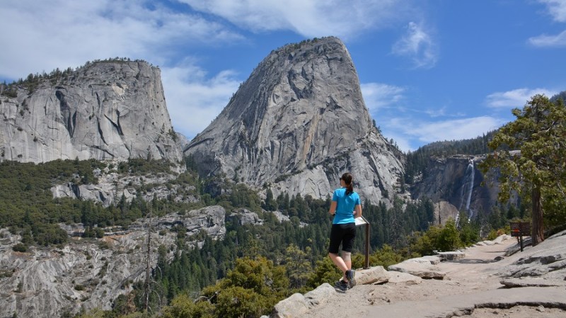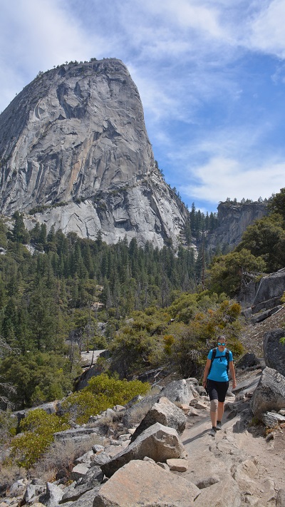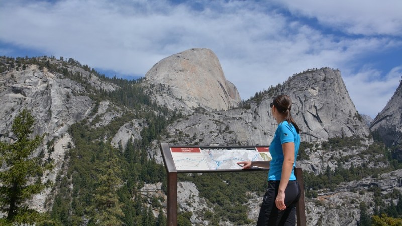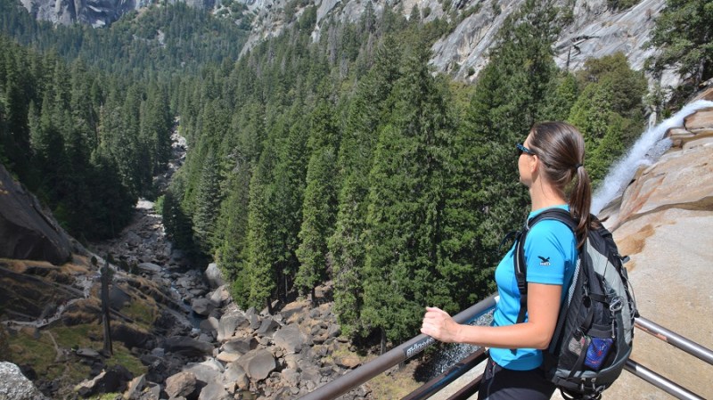 Odpeljala sva se še naprej praktično do konca doline in parkirala na organiziranem parkirišču za vzpon do slapu Vernal. Po gozdni poti sva prišla do izhodišča, nato pa po lepi poti v klanec. Na začetku se kar lepo dvigamo in hodimo po ozki dolini. Vmes je tudi ena postojanka, kjer je WC in lahko si natočite pitno vodo. V parkih vas na vsakem koraku opozarjajo na hidracijo in imate na voljo pitnike. Vljudno vas tudi prosijo, da si natočite vodo v obstoječo steklenico za večkratno uporabo in s tem zmanjšate onesnaževanje našega planeta. Po dobre pol ure hoje zagledate slap Vernal, ki je visok 96 metrov. Slap je bil ob najinem prihodu manjši kot npr. junija in julija, saj je vode precej manj. A še vedno zelo lep. Nadaljevala sva po strmih stopnicah do vrha slapu, nato pa še naprej po poti do razgledne točke Clark Point. Uau, čudovito. Nisva se odločila še za daljšo verzijo do slapu Nevada, saj se od tukaj slap lepo vidi. Pred seboj zagledate mogočno goro Half Dome, ki je prav tako kot El Capitan ena najtežjih plezalnih sten na svetu. Granitna formacija se dviga 1.444 metrov nad tlemi in je res čudovita. Nazaj sva se vrnila po krožni poti do izhodišča, kar toplo priporočam. Poteka po senci in ni tako zelo strma kot pot ob vzponu. Celotna pot nama je vzela dobre 3 ure časa in jo res priporočam. Če imate voljo in dobre noge, jo lahko podaljšate še do slapu Nevada, nikakor pa ne izpustite Clark Pointa za čudoviti razgled.