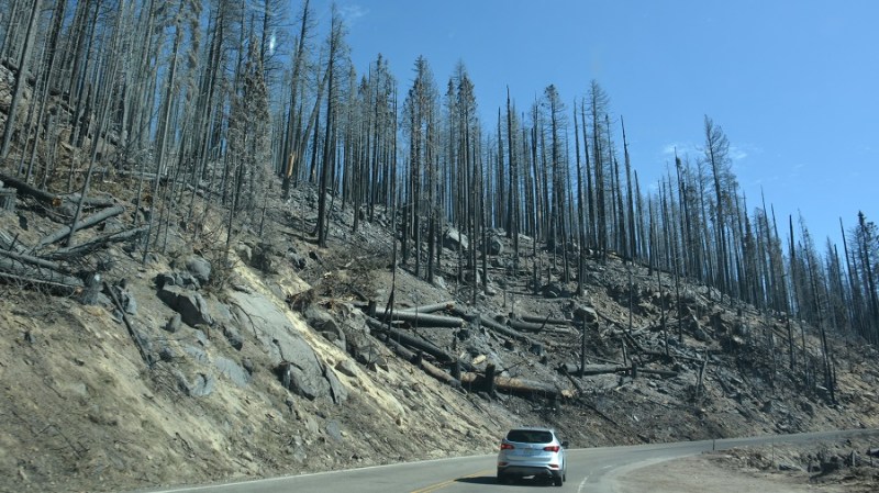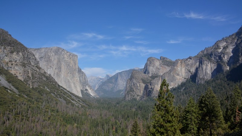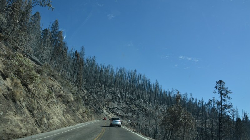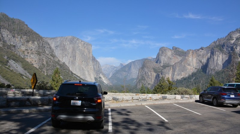 Najina naslednja postojanka je bila razgledna točka Tunnel View, do katere se odpeljete po cesti z avtomobilom. Hkrati je ta razgledna točka na poti do Glacier Point razgledne točke, tako da sva se uspela ustaviti kar dvakrat. Nacionalni park Yosemite je letos avgusta močno prizadel velik požar, ki je divjal na tem območju kar dobre tri tedne. Že na vhodu v park je veliko požganih dreves in podrastja, ampak v tem delu proti Glacier Pointu pa je prava grozljivka. Nekaj dni pred najinim prihodom je požar še vedno divjal in so se močno borili za ohranitev parka. Park je bil skoraj cel avgust tudi zaprt za obiskovalce in ponovno so ga odprli le tri dni pred najinim prihodom. Posledice so bile seveda vidne na vsakem koraku. Na razgledni točki Tunnel View se vam odpre pogled na celo ledeniško dolino Yosemite ter nad mogočnim El Capitanom. Prekrasno!