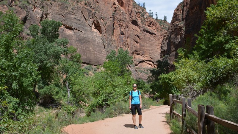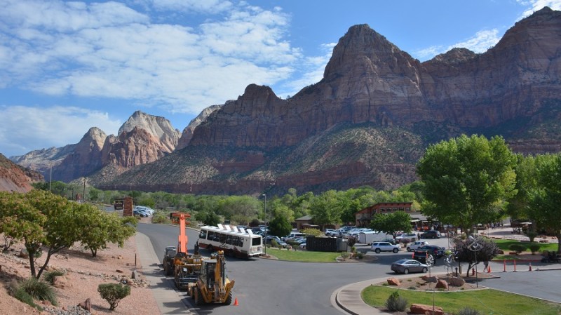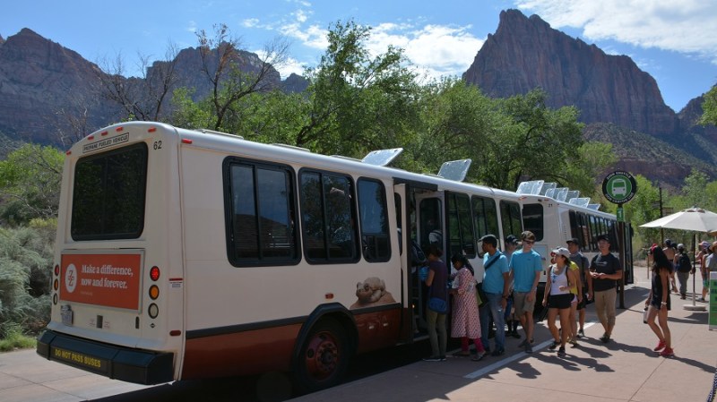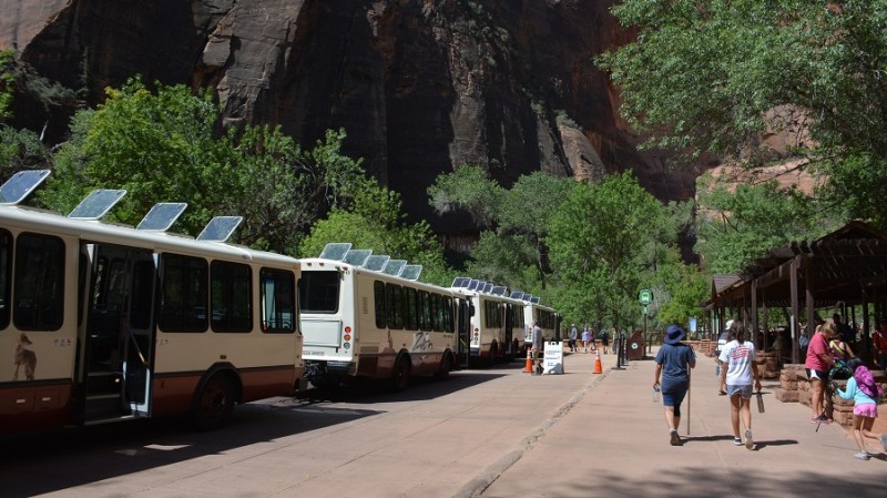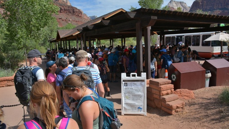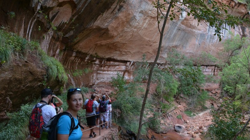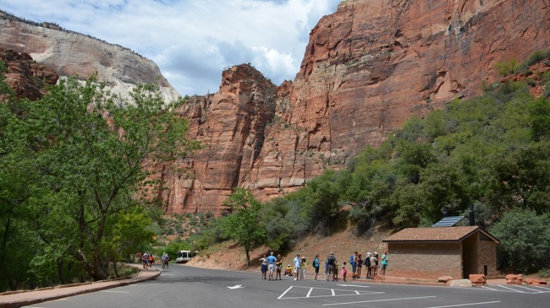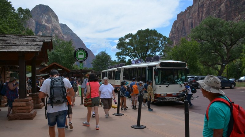 Do nacionalnega parka Zion sva se pripeljala zelo lepo in dokaj hitro. Springdale je mesto pred parkom, kjer je največ hotelov in restavracij. Ustavila sva se v gneči in se spraševala, kaj se dogaja. Ljudi je bilo kot v mravljišču, brezplačna parkirišča so bila vsa nabito polna. Nadaljevala sva po cesti naprej in parkirala na plačljivem parkirišču. Še tega sva le komaj dobila. Pazite, da parkirate res na označenih delih, saj vam sicer kazen ne uide. V nacionalni park Zion že dolgo ne spustijo več avtomobilov, tako da se morate vkrcati na enega od avtobusov, ki brezplačno vozijo po parku in ustavljajo na vseh pomembnih razglednih točkah oziroma izhodiščih za pohodništvo. Kar nisva mogla verjeti množici obiskovalcev. Privoščila sva si še zajtrk in nato čakala kar debelo uro in pol na avtobus, ki naju je odpeljal v park. Vroče je bilo kot v peklu. Za povrh sva izgubila še eno uro, saj je zvezna država Utah že v drugi časovni coni in je treba uro prestaviti za 1 uro naprej.