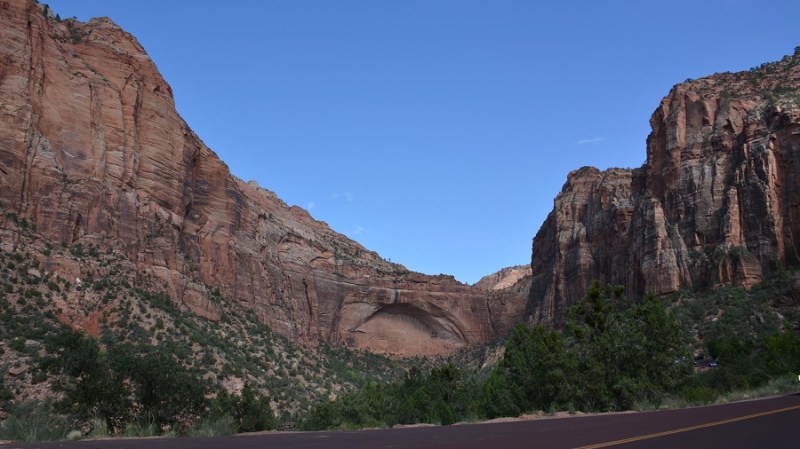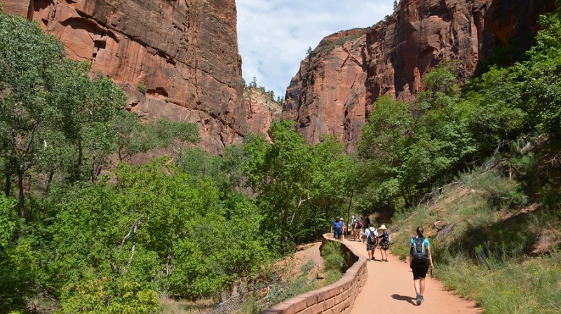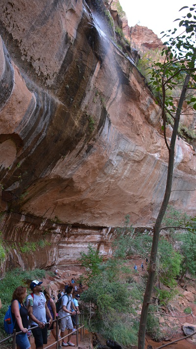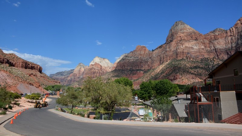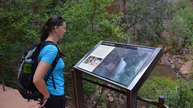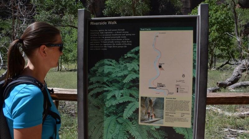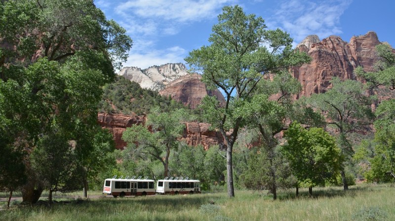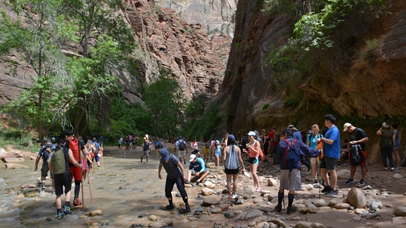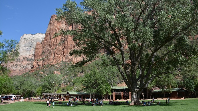 Do nacionalnega parka Zion sva se pripeljala zelo lepo in dokaj hitro. Springdale je mesto pred parkom, kjer je največ hotelov in restavracij. Ustavila sva se v gneči in se spraševala, kaj se dogaja. Ljudi je bilo kot v mravljišču, brezplačna parkirišča so bila vsa nabito polna. Nadaljevala sva po cesti naprej in parkirala na plačljivem parkirišču. Še tega sva le komaj dobila. Pazite, da parkirate res na označenih delih, saj vam sicer kazen ne uide. V nacionalni park Zion že dolgo ne spustijo več avtomobilov, tako da se morate vkrcati na enega od avtobusov, ki brezplačno vozijo po parku in ustavljajo na vseh pomembnih razglednih točkah oziroma izhodiščih za pohodništvo. Kar nisva mogla verjeti množici obiskovalcev. Privoščila sva si še zajtrk in nato čakala kar debelo uro in pol na avtobus, ki naju je odpeljal v park. Vroče je bilo kot v peklu. Za povrh sva izgubila še eno uro, saj je zvezna država Utah že v drugi časovni coni in je treba uro prestaviti za 1 uro naprej.