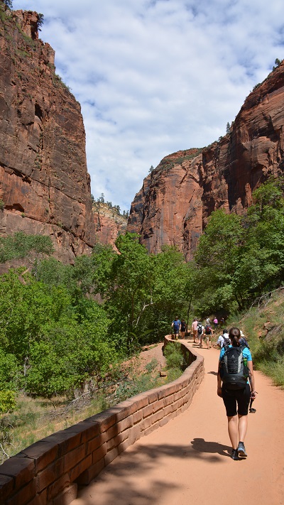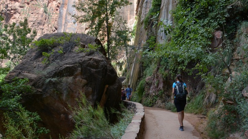 Že v centru za obiskovalce sva se čudila, kaj si vsi izposojajo nepremočljive čevlje za v vodo in za njih drago plačujejo. Midva nikakor nisva imela hoditi po vodi, četudi je bil vodostaj nizek in primeren za hojo. Po ozki dolini nas je avtobus odpeljal po parku in se ustavljal na različnih mestih. Midva sva se odločila, da se najprej odpeljeva do konca parka na zadnjo postajo avtobusa in narediva lepo pohodniško pot ob reki. Odločitev je bila kar prava, saj nama je res ustrezalo malo pretegniti noge. In še pot poteka ob reki, večinoma v senci in bilo je res lepo. Bili so pa redki trenutki, ko sva bila sama. Pravzaprav smo na žalost hodili v koloni. Mnogi so se odločili zadnji del prehoditi s tistimi štorastimi čevlji za vodo in potem še naprej do Sinawa templja. Nama to ni padlo na pamet in sva lepo obrnila in se sprehodila nazaj do izhodišča. Pot poteka po ravnem in za celotno pot sva potrebovala 1,5 ure, tako da jo zmore prehoditi vsak.