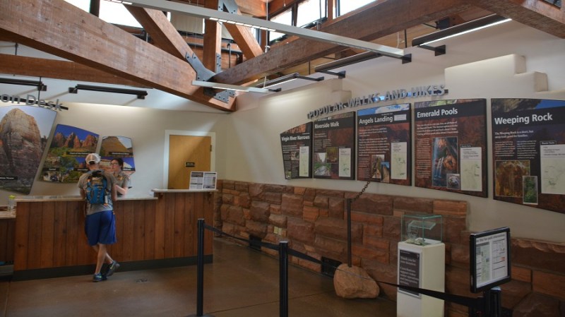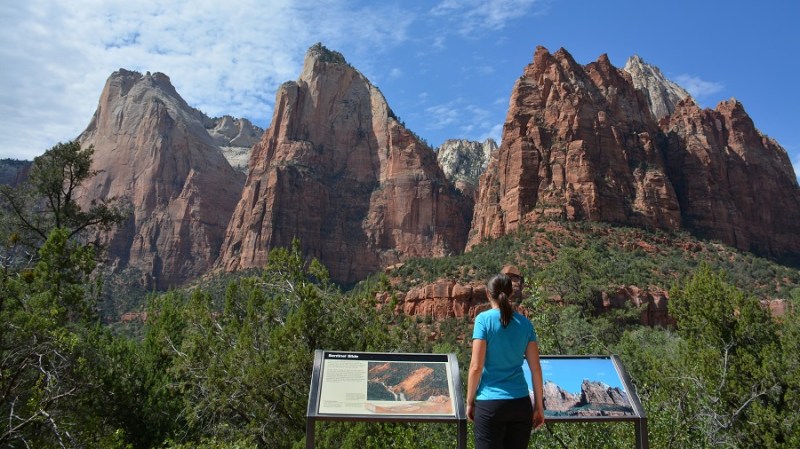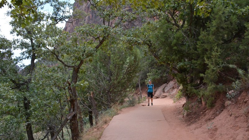 Odločila sva se, da se ustaviva na postojanki, od koder je pešpot, ki vodi do razgledne točke Zion Observation Point. Zelo sem bila nesrečna, saj sem za malo potrebo potrebovala kar 1 uro. Gneča in eno samo stranišče. To pa res ni bilo dobro, ob vsej odlični organizaciji znotraj parkov. Obiskovalci so po številu daleč prehiteli obstoječo infrastrukturo. Prebrala sva, da je do razgledne točke kar nekaj hoje in tudi precej višinske razlike, v planu pa sva imela še kar nekaj postojank za tisti dan. Tudi noge niso bile najbolj sveže. Za pot bi potrebovala vsaj 3 ure in ni se nama izšlo. Menda pa trud nudi zelo lep razgled na park.