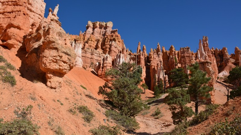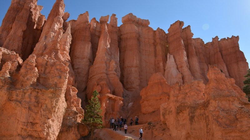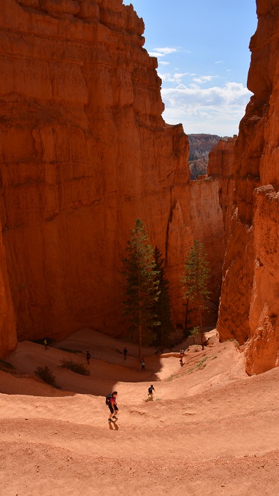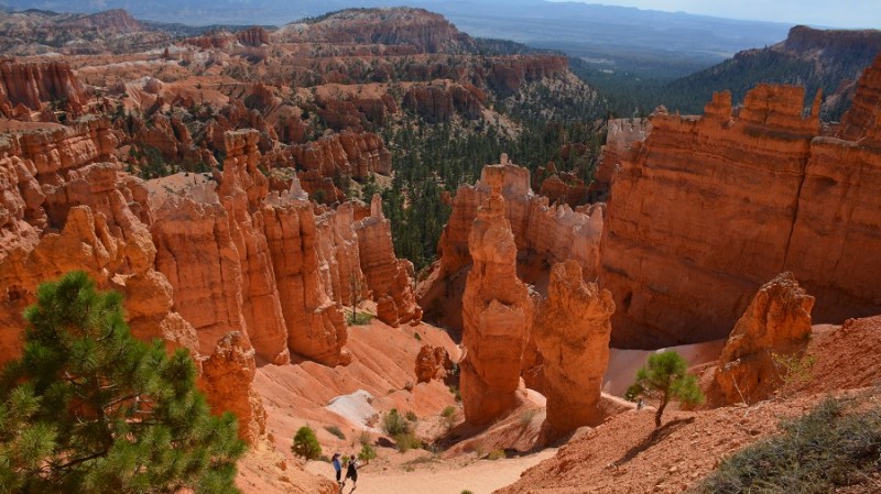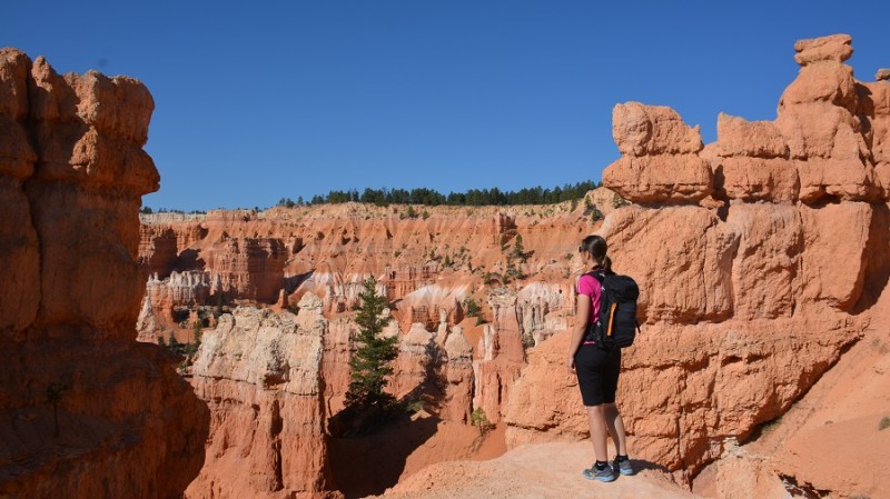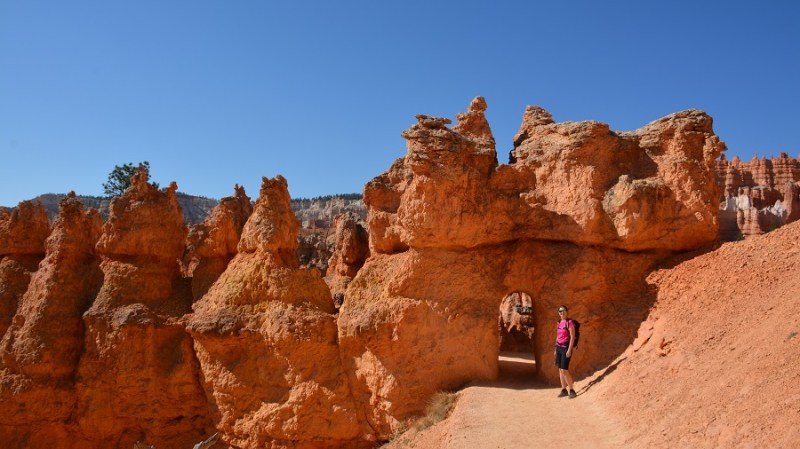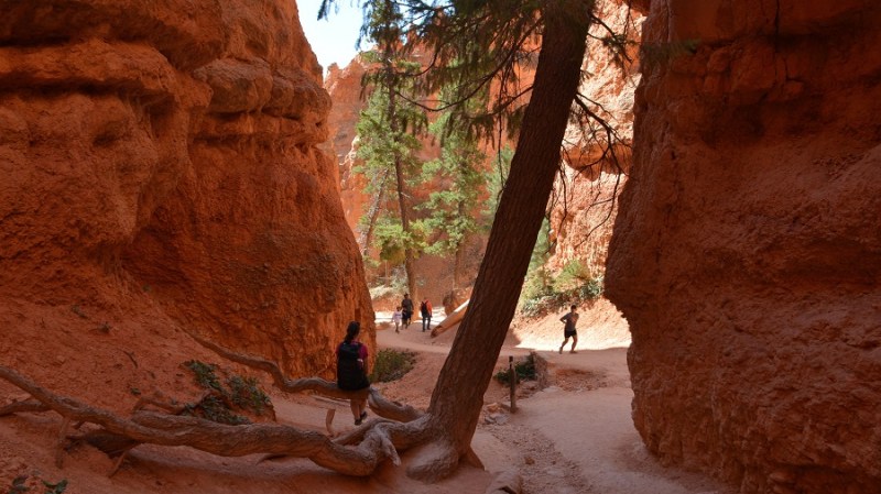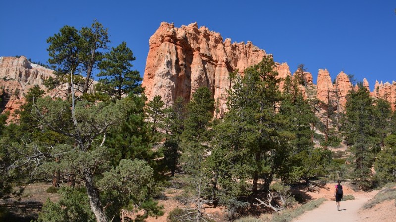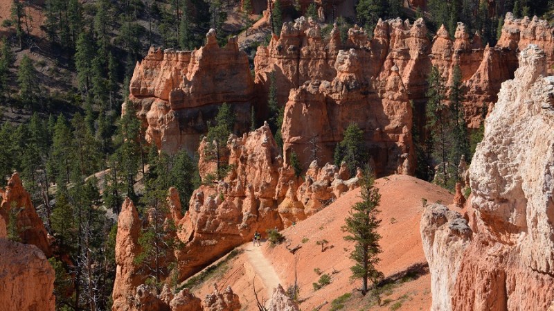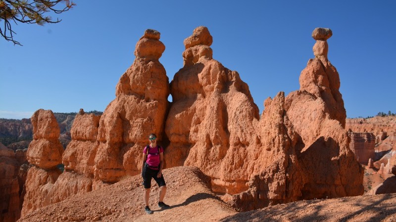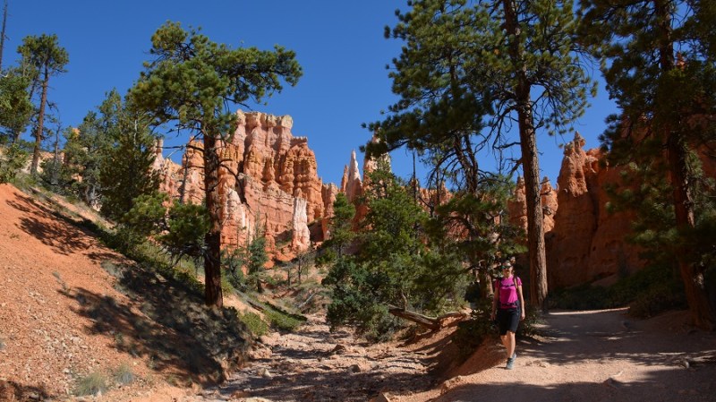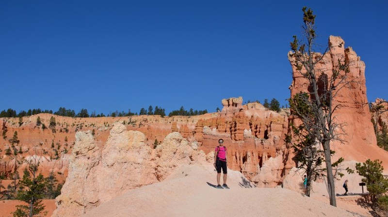V planu sva imela še hojo po pešpoti znotraj kanjona, zato sva za izhodišče izbrala Sunrise Point. Tam sva parkirala avto, se založila s hrano in veliko vode, ter se ob 9. uri že odpravila na hojo po znameniti Queens Garden Trail, ki velja za eno najlepših. Že po prvih korakih sva ugotovila, da je pogled na kanjon z razglednih točk nad kanjonom povsem nekaj drugega, kot pa začutiti kanjon in stožce od blizu. Kar naenkrat sva bila tako majhna. Pot poteka med stožci v globino kanjona obdano z visokimi iglavci. Čisto na vsakem koraku se lahko ustavite, občudujete pokrajino in naredite fotografijo. Kar zamudno je vse skupaj. Ko sva prispela do razpotja, sva se odločila še malo podaljšati pot in krenila na Navajo Trail. Spet zelo lepo in brez obiskovalcev, saj je večina že utrujena in gre nazaj na vrh do izhodišča. Res čudovita pot. Nato pa sva v naslednjem razpotju izbrala vračanje do Sunset Pointa. Uf, pri hoji navzdol v kanjon je bilo vse fino super, navzgor pa sva precej sopihala. Bryce leži na nadmorski višini 2.400 – 2.700 metrov, kar pomeni je kar precej manj kisika v zraku. Zraven pa še močno sonce, ki pripeka veliko močneje in dehidracija se pojavi veliko hitreje. Na vrhu sva morala prehoditi samo še nekaj sto metrov od Sunset Pointa do Sunrise Pointa, kjer naju je čakal najin jekleni konjiček. Res čudovito preživeti 2,5 ure. Nama je bila ta prehojena pot ena najlepših doživetij na potovanju in je nikar ne izpustite. In točno v tem vrstnem redu. Nikakor ne obratno! Zakaj? Zaradi svetlobe, senc, razgledov…