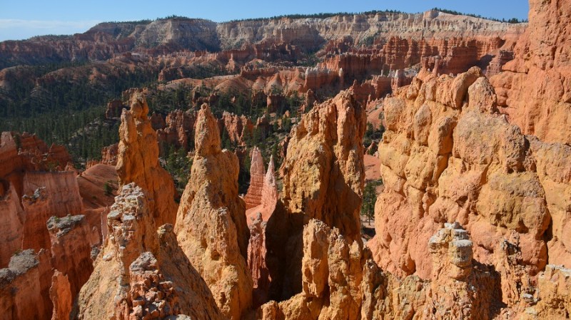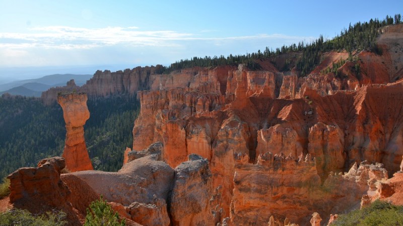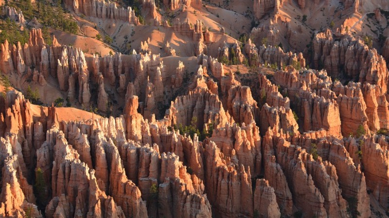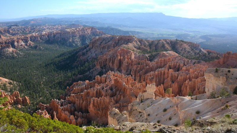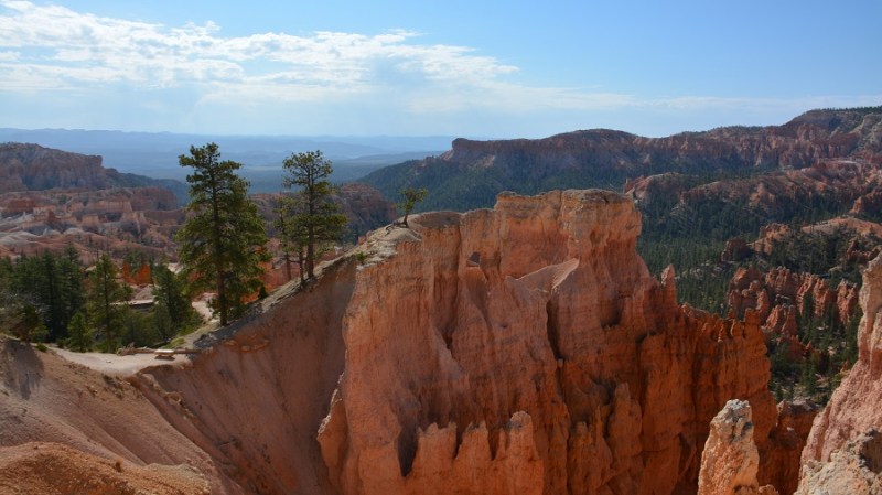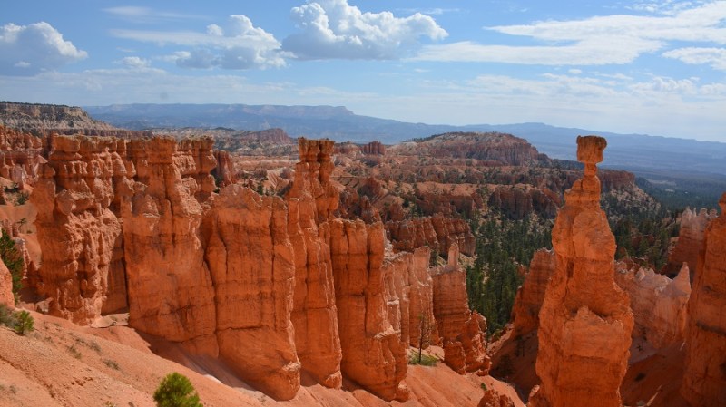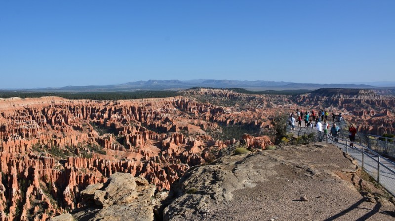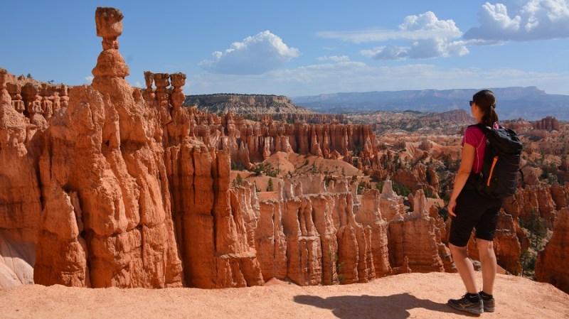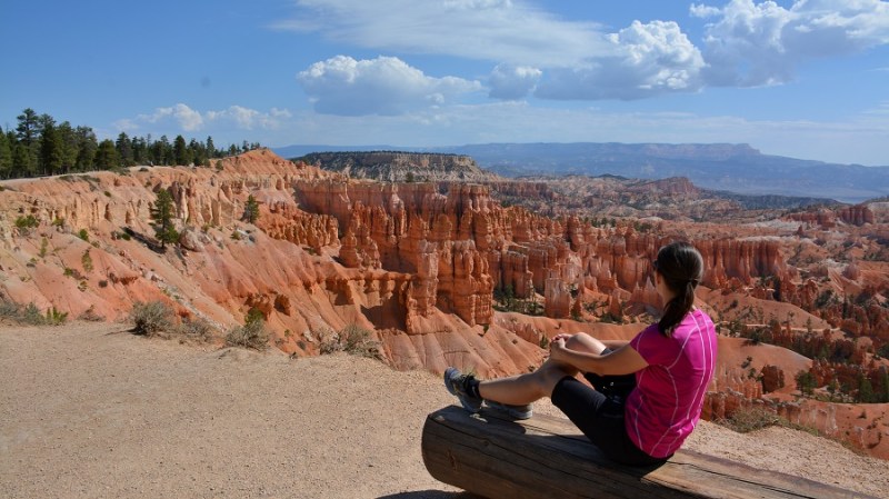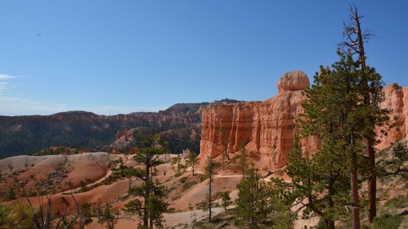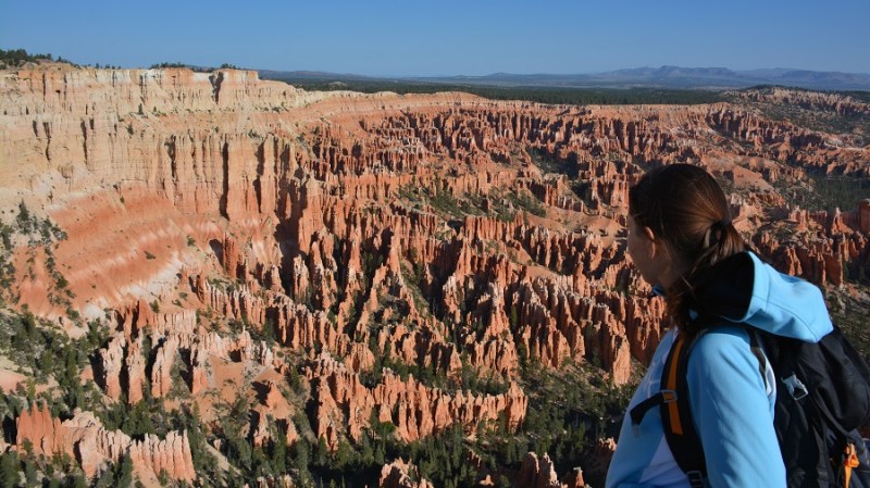 V planu sva imela še hojo po pešpoti znotraj kanjona, zato sva za izhodišče izbrala Sunrise Point. Tam sva parkirala avto, se založila s hrano in veliko vode, ter se ob 9. uri že odpravila na hojo po znameniti Queens Garden Trail, ki velja za eno najlepših. Že po prvih korakih sva ugotovila, da je pogled na kanjon z razglednih točk nad kanjonom povsem nekaj drugega, kot pa začutiti kanjon in stožce od blizu. Kar naenkrat sva bila tako majhna. Pot poteka med stožci v globino kanjona obdano z visokimi iglavci. Čisto na vsakem koraku se lahko ustavite, občudujete pokrajino in naredite fotografijo. Kar zamudno je vse skupaj. Ko sva prispela do razpotja, sva se odločila še malo podaljšati pot in krenila na Navajo Trail. Spet zelo lepo in brez obiskovalcev, saj je večina že utrujena in gre nazaj na vrh do izhodišča. Res čudovita pot. Nato pa sva v naslednjem razpotju izbrala vračanje do Sunset Pointa. Uf, pri hoji navzdol v kanjon je bilo vse fino super, navzgor pa sva precej sopihala. Bryce leži na nadmorski višini 2.400 – 2.700 metrov, kar pomeni je kar precej manj kisika v zraku. Zraven pa še močno sonce, ki pripeka veliko močneje in dehidracija se pojavi veliko hitreje. Na vrhu sva morala prehoditi samo še nekaj sto metrov od Sunset Pointa do Sunrise Pointa, kjer naju je čakal najin jekleni konjiček. Res čudovito preživeti 2,5 ure. Nama je bila ta prehojena pot ena najlepših doživetij na potovanju in je nikar ne izpustite. In točno v tem vrstnem redu. Nikakor ne obratno! Zakaj? Zaradi svetlobe, senc, razgledov…