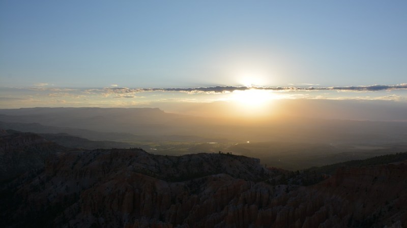 Iz najinega motela v Tropicu sva se podala že ob 5h še v trdi temi. Najin cilj je bil sončni vzhod in lepe barve nad amfiteatrom kanjona. Na razgledni ploščadi nas je bilo kar nekaj in zmrzovali smo do kosti. Nobena bunda, jakna ni pomagala. Želela sem si le svoje zimske puhovke, smučarskega perila, šala, kape in rokavic. Končno je posvetilo sonce izza meglice in prvi žarki so lepo obsijali amfiteater. Več kot to pa se žal ni zgodilo in sva bila kar precej razočarana. Čisto po pravici – ni bilo vredno zmrzovanja.