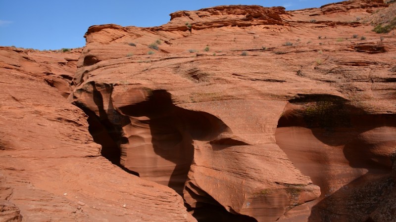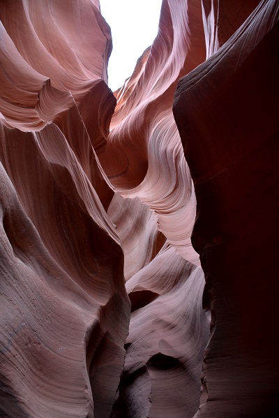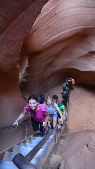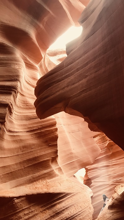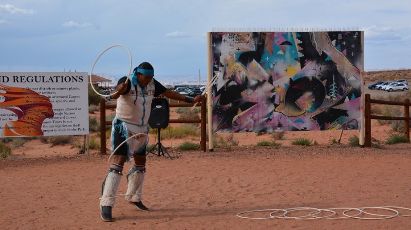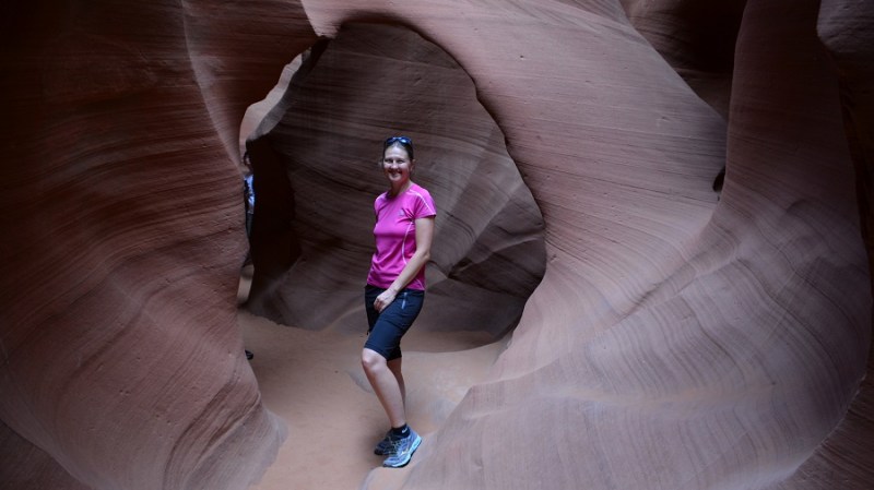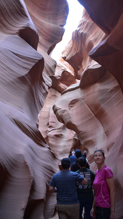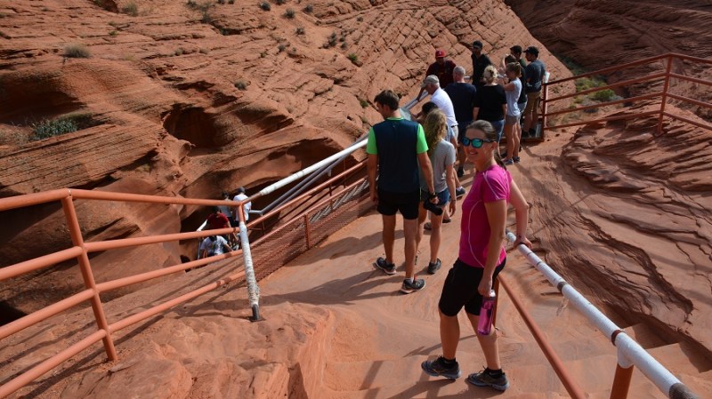 Točno ob 15.45 sva imela že mesece vnaprej plačan ogled indijanskega kanjona Lower Antelope. Na tem območju povsem skupaj sta dva takšna kanjona in sicer Upper in Lower (zgornji in spodnji). Upper je veliko bolj poznan, tudi večji in sprejme več obiskovalcev. Zaradi res visokih cen vstopnin, se večina odloči le za enega in običajno spodnjega. Na licu mesta kart ne morete več dobiti, ker so tedne in mesece vnaprej razprodane. Oziroma vsaj ne ob urah, ki si jo vi želite. Običajno ostanejo karte za kakšen dan, dva naprej za zelo jutranje ali večerne ure. Te pa so potem zaradi sonca najslabše. V obeh kanjonih namreč potrebujete opoldansko sonce za lepe barve. Midva sva najprej rezervirala le Upper kanjon, potem pa sem tik pred zdajci kupila karte še za Lower kanjon. Nekako nama je zneslo v planu, a lahko sem izbrala le popoldansko uro, saj sva dopoldne preživela še v Brycu. Svetloba je bila zato temu primerna, a sva vseeno nadvse uživala. Pred odhodom v kanjon nam je zaplesal pravi Navajo Indijanec njihov tradicionalni ples z obroči. Fantastično! Lower kanjon je ozek in poseben. Ko zagledaš kam boš šel, te kar malce stisne. Včasih sem jaz komaj zlezla skozi prehod, ima čudovite oblike in je zelo zavit. Prostora je praktično res za enega človeka. Gneča? Za znoret. Na 10 minut skupine po 20 ljudi. V kanjonu pa kolona in čakanje. Paše, saj si lahko vsaj dlje časa v kanjonu. Kanjon je izoblikovala voda. In ga še vedno oblikuje, ko pride deževje. Še vedno povsem živa stvar in delo mati narave. Prekrasno!