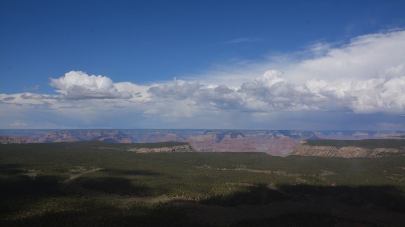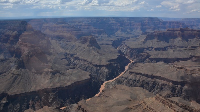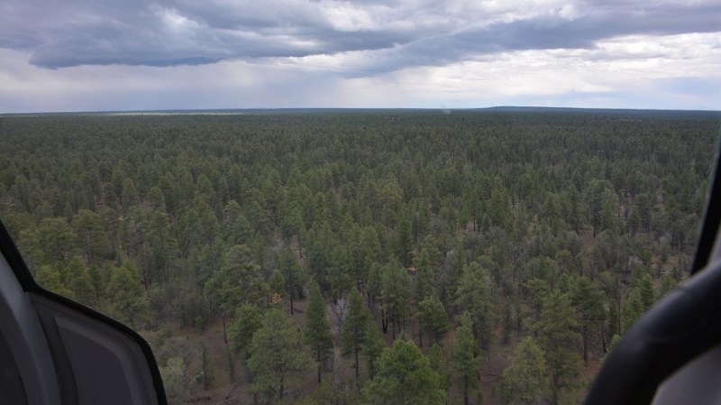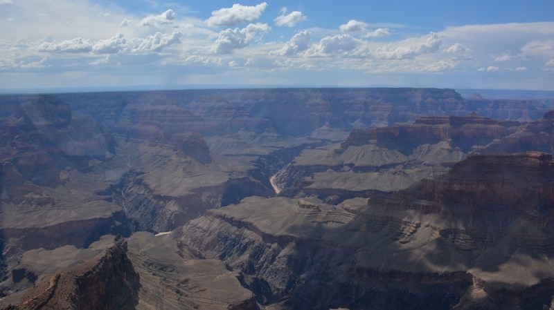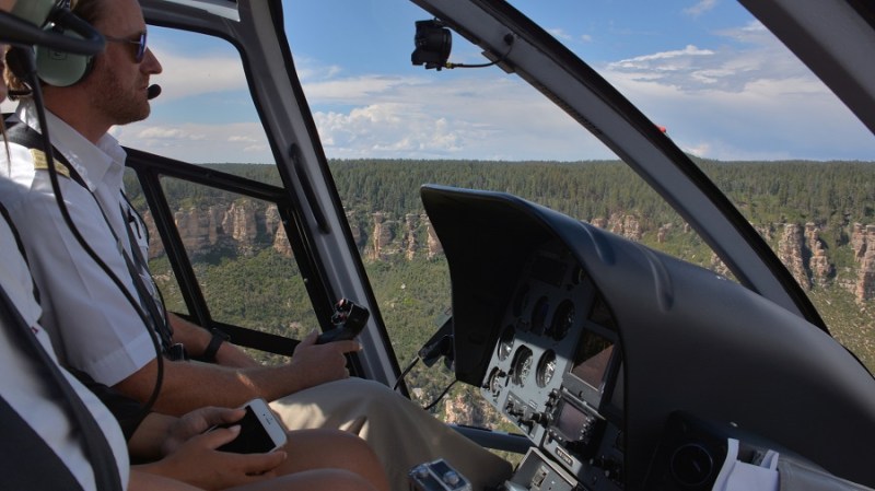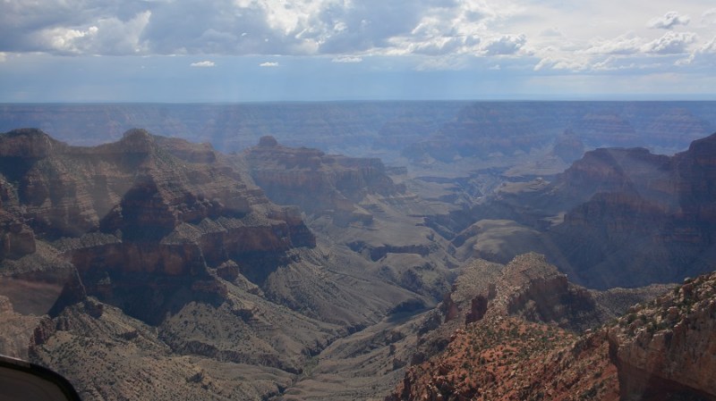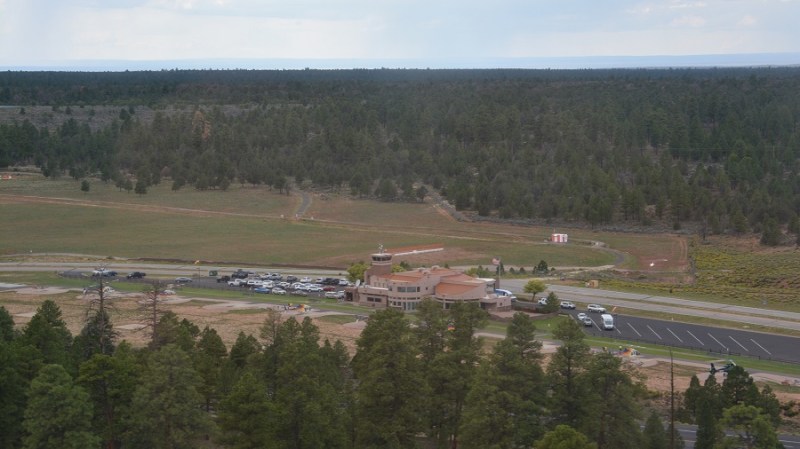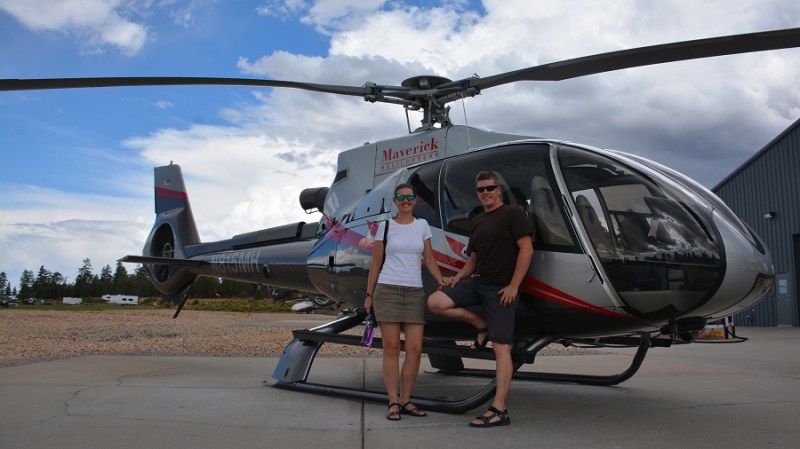 Polet s helikopterjem nad velikim kanjonom je bila najina dolgoletna želja in sva si jo seveda morala uresničiti. Že doma sem pred meseci rezervirala in plačala 45-minutni polet nad kanjonom in sicer veliki krog, ki bi naju popeljal celo nad severno stran in še nad vzhodno stran. Ko sva prispela v Tusayan na letališče, sva bila takoj opozorjena, da se s severne strani približuje grozna nevihta in da ta polet ne bo mogoč ter da bomo naredili samo mali krog, ki pa je seveda tudi najlepši. Malce razočaranja, a naravi se ne da ukazovati. Poleteli smo z Maverick Helicopters, ki imajo res najboljše helikopterje v floti, saj so v večjem delu stekleni in zato prilagojeni za turistične oglede. Z zraka sva lahko opazovala pokrajino. Praktično je na celi južni in severni strani gozd, potem pa se dobesedno zemlja vdre 1,6 km globoko. Leteli smo počasi in zelo lepo nad kanjonom in opazovali prečudovito delo mati narave. Polet je trajal dobrih 25 minut. V daljavi smo že lahko videli, kako se nam približuje nevihta. Ko smo pristali, je bilo nebo nad nami popolnoma črno in začele so padati kaplje. Praktično smo ujeli zadnji vlak za polet tistega dne. Kako zelo sem bila hvaležna in srečna!