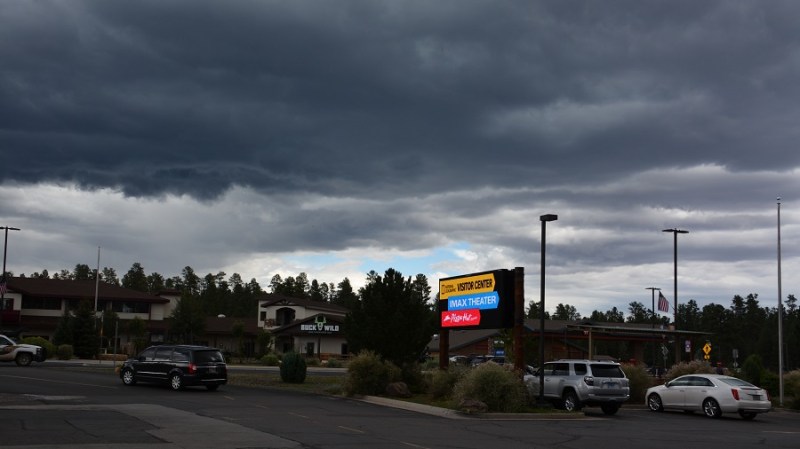 Ko sva se čez nekaj minut pripeljala v Tusayan in se ravnokar odpravila v Imaxovo kinodvorano National Geographica za ogled filma, je začelo noro deževati. Temperatura se je v nekaj minutah spustila iz plus 30 na 10 stopinj in postalo je grozno mrzlo. Tega si nisem niti v sanjah predstavljala. Ogledala sva si film o nastanku, zgodovini in življenju v Grand Canyonu skozi zgodovino. Krasen film vreden ogleda, če vam časovno znese. Fotografiranje in snemanje seveda ni dovoljeno.