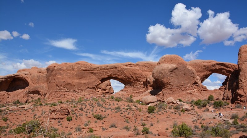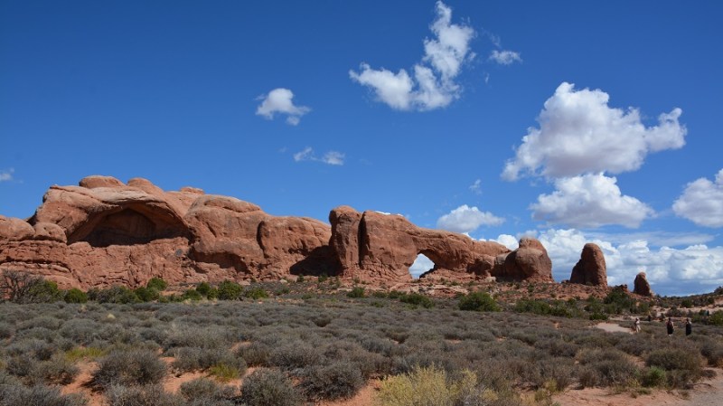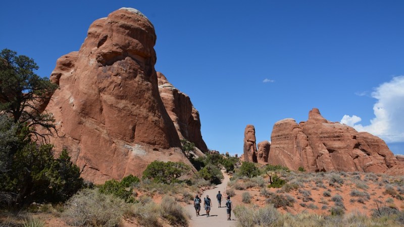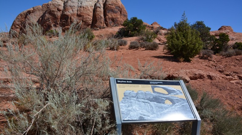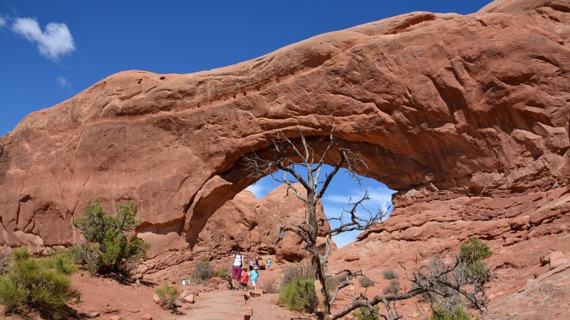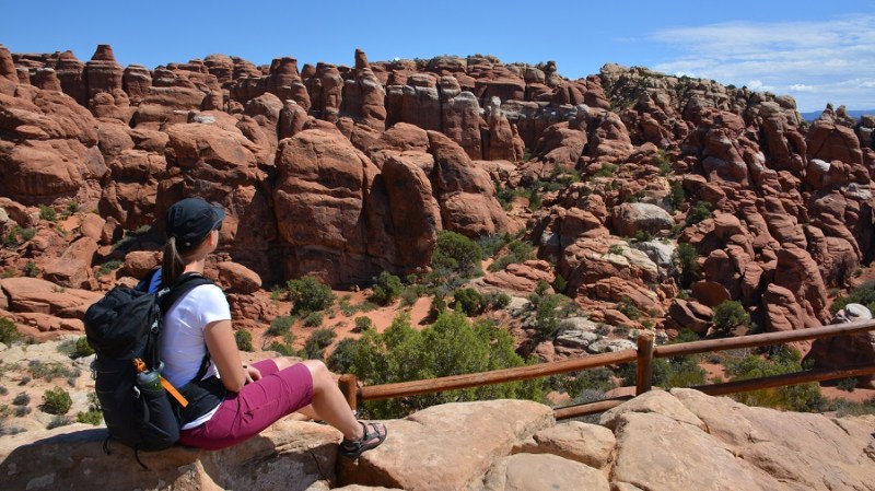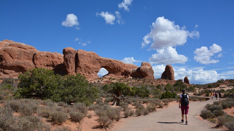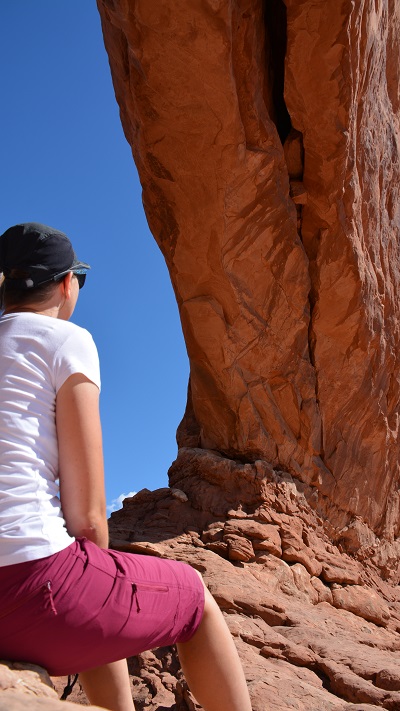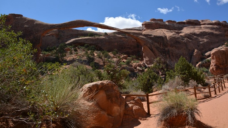 Odločila sva se, da se najprej odpeljeva povsem do konca parka in se sprehodiva do najdaljšega naravnega loka, ki se imenu Landscape Arch. Velja za najdaljši naravni lok na svetu, ki pa ga odlikuje to, da je zelo dolg in zelo tanek. Lok je na enem delu širok le še 1,8 metra in njegova dolžina je okrog 100 metrov. Parkirala sva na prepolnem parkirišču in se po res hudi vročini odpravila do loka. Sonce pripeka! Park je na nadmorski višini okrog 1.700 metrov, kar še dodatno povzroča dehidracijo. Veliko vode, kapa oziroma kar dežnik za senco, krema proti soncu in dobra volja. Hoje je za približno pol ure v eno smer pretežno po ravnini. Ko od daleč zagledaš naravni lok, je trud poplačan, saj je res fantastičen.