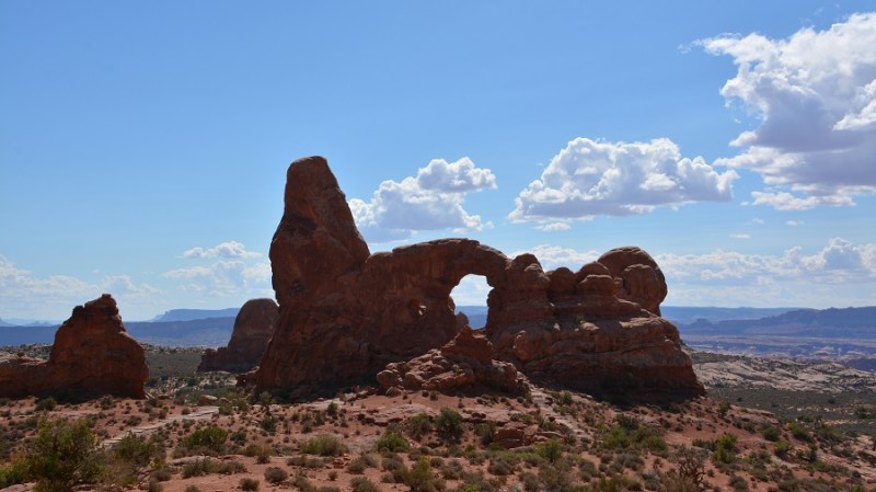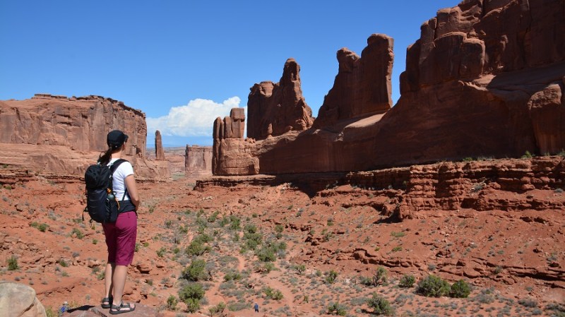 Sledila je vožnja do nacioalnega parka Arches, ki se nahaja v neposredni bližini simpatičnega mesta Moab. Midva sva z vožnjo kar v park in si ogledovala različne naravne skulpture. V nacionalnem parku najdemo več kot 2000 nepravilnih kamnitih skulptur najrazličnejših oblik in velikosti. Najbolj poznani so prav naravni kamniti loki, ki jih je v parku več kot 200. Po parku je speljana lepa asfaltirana cesta z več postojankami in parkirišči, od koder potem vodijo peš poti do naravnih znamenitosti. Upala sva, da je v parku tudi kakšna koča s hrano in pijačo, a sva se zmotila. V parku ni ničesar za pod zob, tako da vzemite vso hrano in pijačo za cel dan s seboj. Najina prva postojanka je bila Park Avenue, od koder je lep razgled na čudovite naravne skuplture.