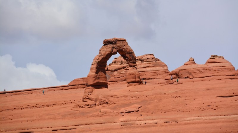 Najina zadnja postojanka pa je bil znameniti Delicate Arch, ki ga vidimo na vseh reklamnih materialih za državo Utah, na registrskih tablicah in na vseh turističnih materialih na naslovnici. Najprej sva želela do njega hoditi po 5 kilometrov dolgi poti ob poznih popoldanskih urah, da bi tam počakala na prekrasen sončni zahod in čudovite rdeče barve. A ker nama vreme ni bilo naklonjeno (bile so napovedane nevihte, grozni oblaki so prekrivali nebo in sonca že skoraj ni bilo več), sva se odločila, da greva samo do razgledne točke. To je drugo parkirišče kot za treking. Od tam sva tudi midva hodila kar dobrih 20 minut do razgledne točke, ki pa je pravzaprav zelo oddaljena od naravnega loka. Vseeno pa se ga lepo vidi, seveda če imaš s seboj dober daljnogled in dober fotoaparat z zoomom. Sicer pa je res majhen.
