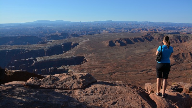 Na pot sva krenila takoj po sončnem vzhodu in se odpravila najprej v nacionalni park Canyonlands. Precej kilometrov in zavita cesta naju je popeljala povsem do konca parka na razgledno točko nad kanjonom. Bila sva prva obiskovalca v prečudoviti naravi. Razgledna ploščad se nahaja nad kanjonom, ki je večplasten. Privoščila sva si zajtrk v miru in tišini. Ogromen kanjon sta ustvarili dve reki – Colorado River in Green River. Nacionalni park je priljubljeno rekreacijsko središče, saj nudi mnoge pohodniške poti. Park je priljubljen tudi med gorskimi kolesarji ter seveda za vožnjo s štirikolesniki. Ustavila sva se še na dveh razglednih točkah, ko sva se vračala že nazaj po cesti proti vhodu in se naužila res lepih razgledov.
