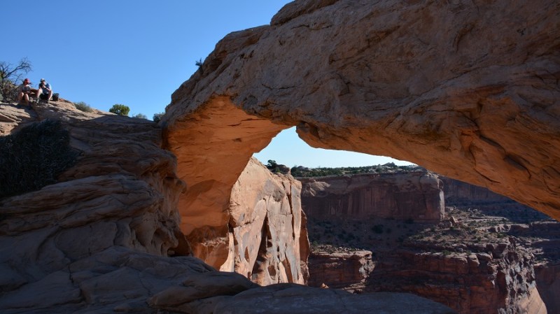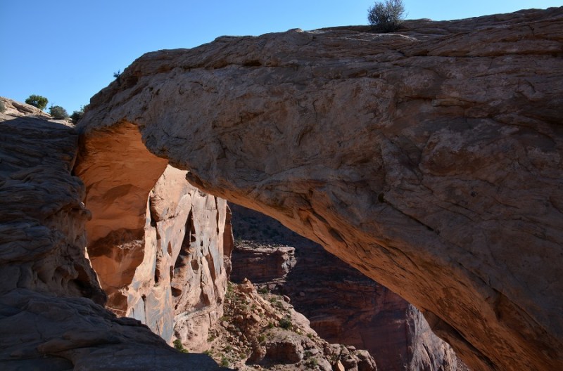 Čez nekaj kilometrov vožnje, sva se ustavila in naredila še kratko pohodniško pot do slovitega naravnega loka Mesa Arch. Dobrih 10 minut hoje po lepi poti vas pripelje do čudovitega loka iz peščenjaka, ki je velikokrat tudi fotografija ozadja na računalniku. Jutranje sonce ga je lepo osvetilo s spodnje strani, skozenj pa je čudoviti pogled na kanjon in ostale peščene tvorbe.