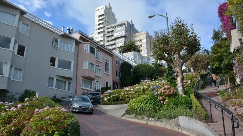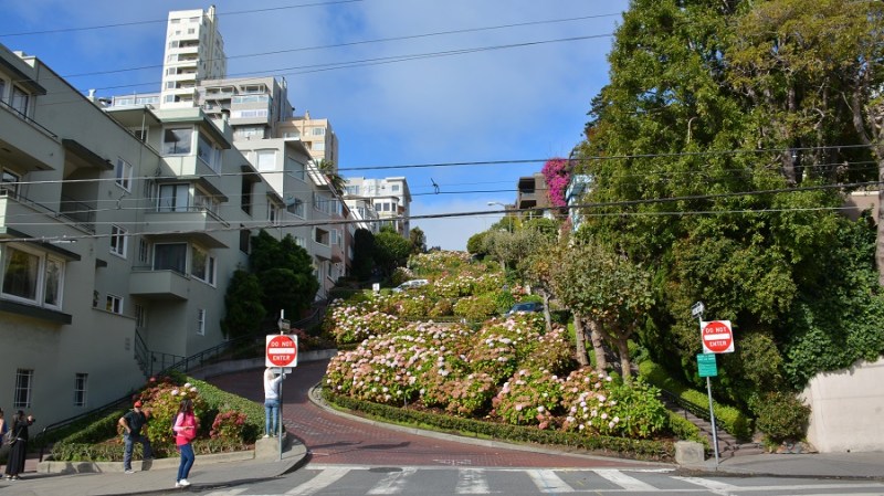 Iz hotela sva po tisti naši “drogeraški” ulici pohitela do avtobusne postaje, kupila enosmerni vozovnici kar na avtobusu pri šoferju in se odpeljala nekaj postaj severno do slovite ulice Lombard. Ko sva se morala od postaje povzpeti po zelo strmi ulici, sva se kar smejala drug drugemu, saj sva šele danes občutila “mesto na hribčkih“. San Francisco je namreč znan po zelo strmih ulicah v nekaterih predelih. Tako strmih, da avtomobili parkirajo vodoravno in da pri vožnji z avtom sploh ne vidiš ceste, ko prideš na vrh hriba. Da ne govorim o speljevanju na križiščih, ki je nehumano. Še sreča, da so avtomobili avtomatiki, saj bi sicer vsi sklopko skurili vsak dan. Res zanimivo in hkrati smešno. Ulica Lombard je znana po zaviti enosmerni cesti, kjer je zasajeno tudi veliko število hortenzij. Zelo lepa kratka tlakovana cesta je zelo priljubljena pri turistih, a zato manj pri domačinih. Vse hiše ob ulici se prodajajo, ker je v njih postalo življenje nevzdržno. Velika turistična zanimivost so tudi stari leseni tramvaji, ki vozijo po strmih ulicah. Tokrat viseči most v gosti megli, ki se ni umaknila vse do večera. Res sva imela včeraj srečo.