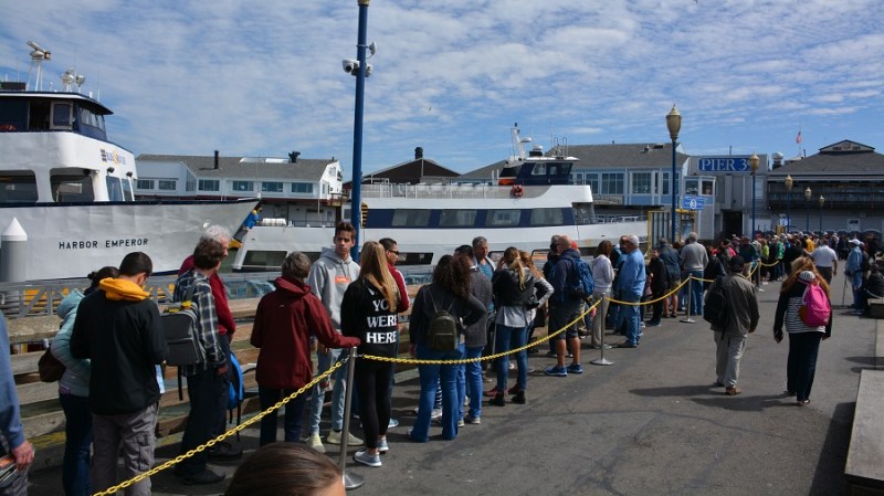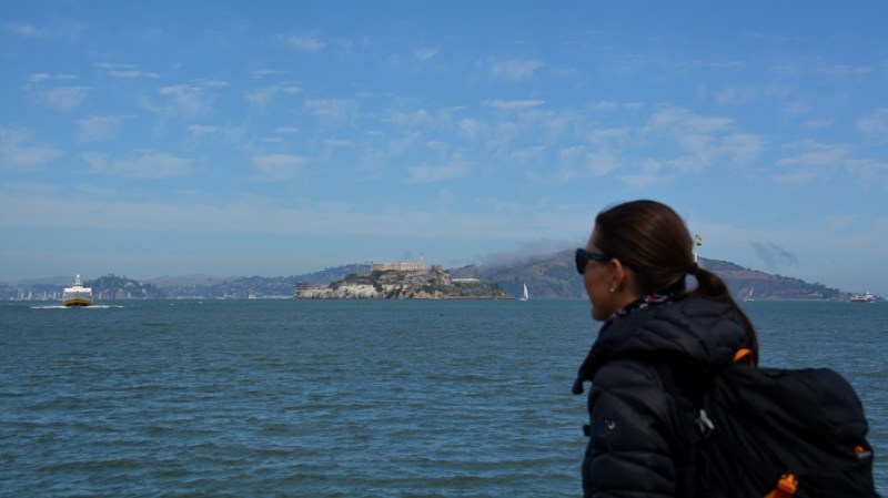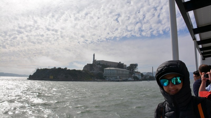 Za ogled zapora Alcatraz si je potrebno vnaprej kupiti na internetu vstopnice, sicer boste ostali brez ogleda. Skoraj zagotovo so le-te prodane za tedne vnaprej, če želite pa še določeno uro, pa tudi mesece vnaprej. Jaz sem jih kupila 3 mesece pred odhodom, takoj ko so bile na voljo. Pred nama sta bili dve turistki na blagajni in so jima rekli, da so prve karte na voljo šele čez 4 dni. Morali bi videti njune obraze še naslednjih 30 minut. Trajekt za zapor Alcatraz vozi s pomola 33. Ko pridete do tja, vidite gnečo in vam je hitro jasno, zakaj je potrebno kupiti vstopnice toliko vnaprej. Midva sva imela ogled ob 15:30, tako smo bili zadnja ladja za dnevni ogled zapora. Ponujajo tudi nočni ogled, ki je še malo bolj “grozljiv”. Na trajektu ste lahko na odprtem ali v zaprtem prostoru. 20 minut vožnje in že ste na zloglasnem otoku. Že čez dan je bilo v San Franciscu zelo mrzlo, kljub sončnemu dnevu. Jaz sem si oblekla kar puhovko in mi je bilo ravno prav. Za Alcatraz pa se še posebej toplo oblecite. Piha leden veter.