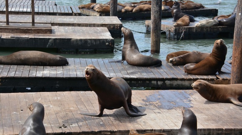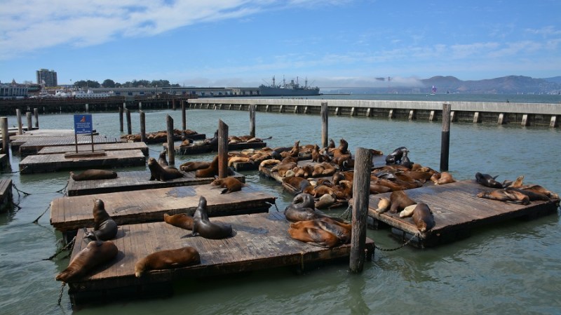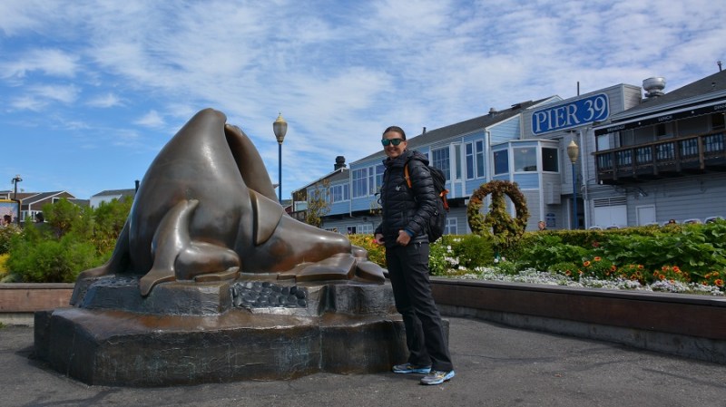 Ko sva prispela v stari pristaniški del mesta, sva skoraj padla po tleh od števila turistov in same turistične ponudbe. Že dolgo časa nisva videla na enem mestu toliko turistov. Sprehodila sva se po ulici, nakupila tudi midva nekaj spominkov in se utrujala z nakupom poštnih znamk. Šele v četrtem poizkusu nama je uspelo poslati domov razglednico. Jajmene, Amerika! Ob znamenitem pomolu 39 živijo tudi morski levi, ki se sončijo in glasno pogovarjajo med seboj. Lačni se odpravijo v zaliv na ribolov. Na pomolu je tudi veliko število trgovin, restavracij in lokalov. V eni izmed restavracij sva si tudi midva privoščila kosilo. Kaj drugega kot “fish & chips“.