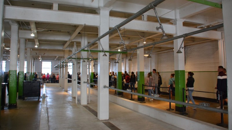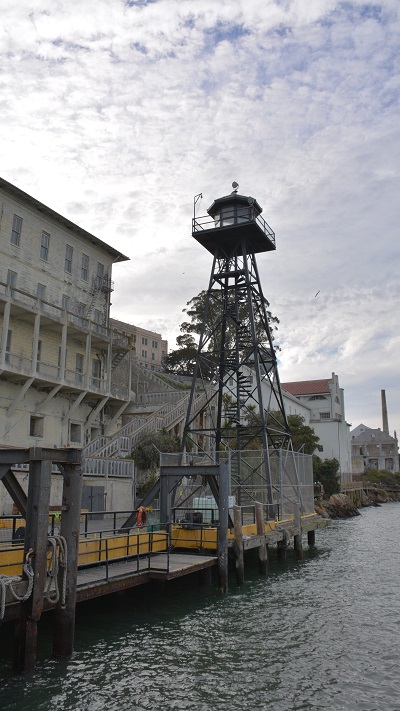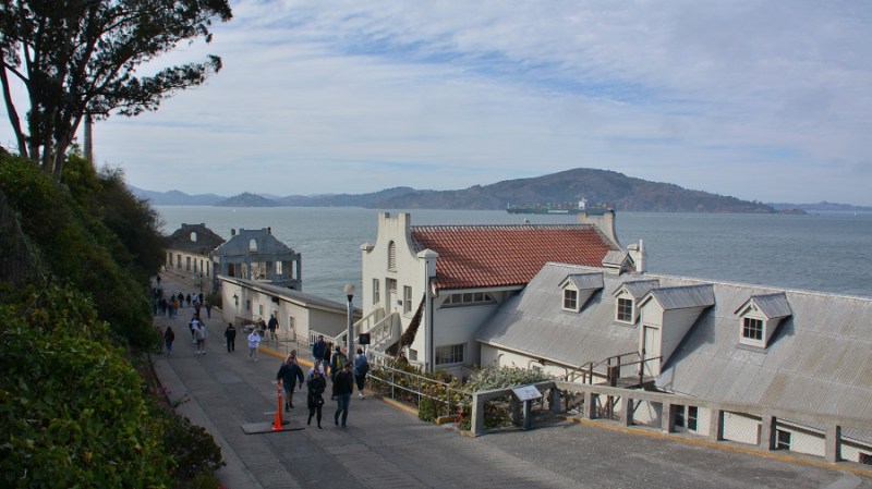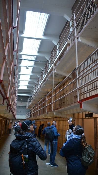 Ko smo pristali na otoku, smo dobili nekaj uvodnih pojasnil in navodil za lepo vedenje na otoku. Otok ima seveda več objektov, a vsi niso na ogled. Ogledate pa si seveda lahko notranjost najbolj zanimive zgradbe na otoku – zaporniško zgradbo. Na otoku so že leta 1859 zgradili trdnjavo, ki je služila vojski in med ameriško državljansko vojno postala tudi zapor. A vojska je otok dokončno zapustila leta 1933 in takrat je Alcatraz postal civilni zapor. A kmalu to ni bil več običajen zapor, ampak je bil zapor z največjo varnostjo, v katerem so kazen prestajali najtežji kaznjenci. Torej tudi tisti, ki so v drugih zaporih povzročali težave. Zapor Alcatraz je s tem dobil tudi svojo slavo in zloglasnost. Ob vhodu v zaporniško stavbo smo vsi obiskovalci prejeli avdio vodič, ki je res odličen. Že dolgo nisem doživela tako zanimive predstavitve skozi avdio vodič, ki te vodi skozi vse prostore zapora. Najprej te popeljejo skozi kopalnico, nato pa do zaporniških celic običajnih zapornikov. Le-teh je bilo približno 260, saj kapacitete niso bile nikoli v celoti zapolnjene. Na otoku je živelo tudi do 300 civilistov in sicer pazniki s svojimi družinami. Otroci so imeli tudi urejeno varstvo in šolanje na otoku. V samem začetku je bil v zaporu res strogi red in tišina, zaporniki so imeli lahko zelo malo obiskov in tudi gibanje zelo omejeno. Nato pa so z leti ta pravila malce omilili in so lahko zaporniki celo obedovali skupaj in se pogovarjali ter ob nekaterih urah celo igrali na instrumente v svojih celicah. To je seveda privedlo to več komunikacije in tako so trije zaporniki leta 1963 uspeli v svojih celicah izdolbsti luknjo in pobegniti z otoka. Še do danes jih niso našli in so še vedno med pogrešanimi osebami. Iz zapora naj bi bilo namreč praktično nemogoče pobegniti, saj je pobeg preprečevalo tudi ledeno mrzlo morje in izredno močni tokovi. Po pobegu so zapor po 30-ih letih delovanja zaprli in zapornike preselili v drug zapor.