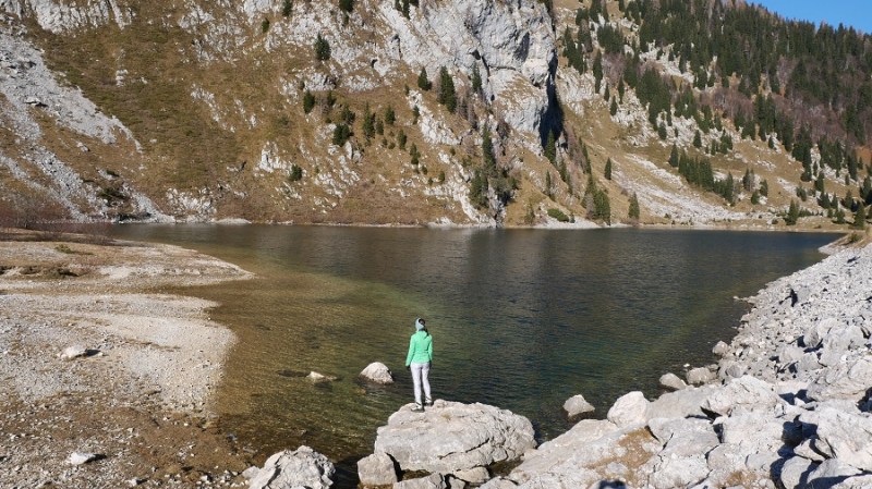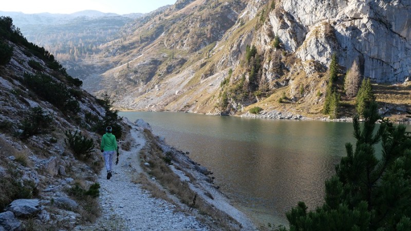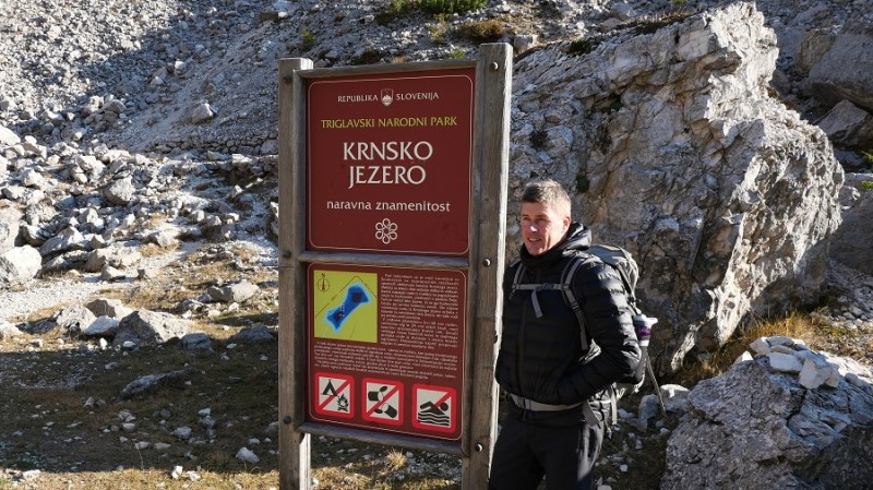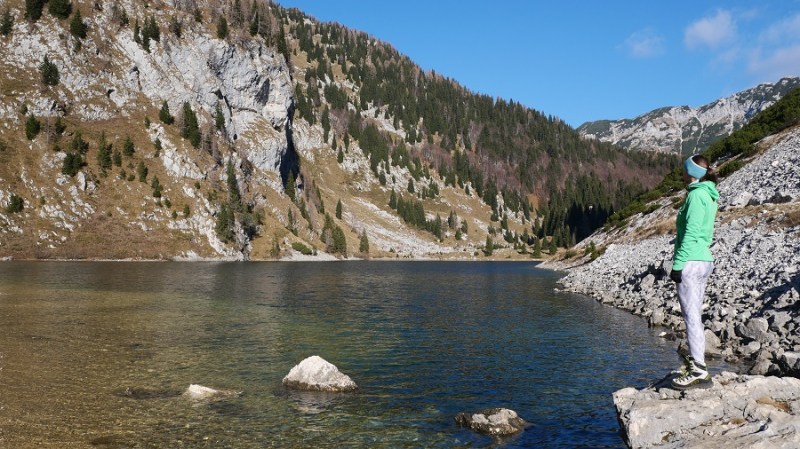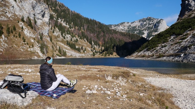 Po desetih minutah zmerne hoje prispete do Krnskega jezera, ki velja za največje slovensko visokogorsko jezero. Dolgo je 390 m, široko 150 m in globoko 17,5 m. Gladina vode niha za 2 metra in najvišja je v začetku poletja. Je ledeniškega izvora in leži sredi kraškega sveta pod Krnom, Batognico, Lemežom in Malim Šmohorjem. Kopanje je zaradi bogatega živeljenja strogo prepovedano, kar pa seveda poletni obiskovalci ne upoštevajo, zato je njegova biosfera močno ogrožena. Bilo je res mrzlo, saj je ob jezeru še za nameček pihal grozljivo mrzel veter. A midva se nisva pustila motiti. Na sončku sva si pogrnila odejo in si privoščila pravi pozno jesenski piknik pri minus 5 stopinjah. Nikjer ni bilo žive duše, zato sva kljub mrazu do kosti res uživala.