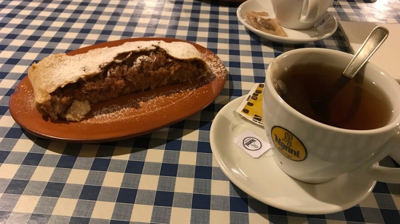 Do izhodišča sva se seveda vrnila po isti poti in se ogrela do avtomobila. Čez prelaz Vršič sva se ponovno vozila brez gneče in se prvič ustavila pri Mihovem domu na poznem kosilu. Postregli so nama z odličnim domačim jabolčnim zavitkom in planinskim čajem. Res vam priporočam pohodiški izlet v vseh letnih časih, ker je pot čudovita. Midva se zagotovo še vrneva, saj sva preživela še en nepozaben dan v objemu naših gora.