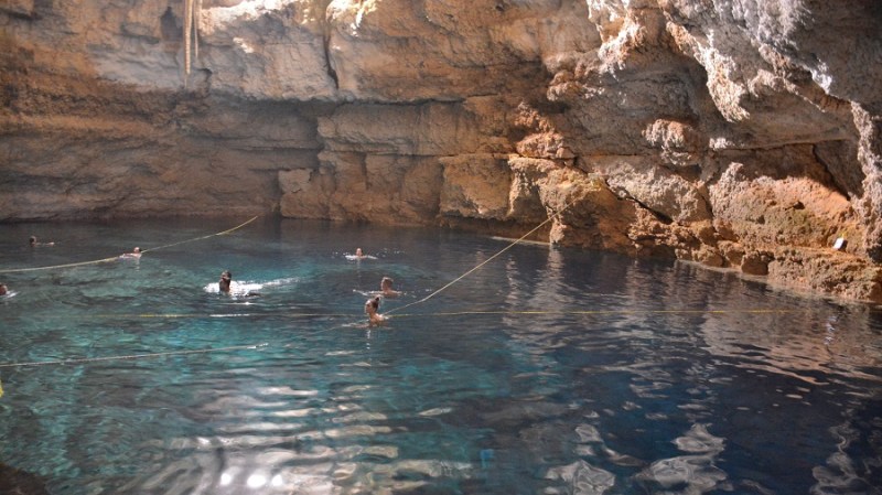 Po ogledu majevskih ruševin v Cobi sva se odpeljala do bližnje Cenote Multum Ha. Prašna makadamska cesta naju je pripeljala do mini parkirišča za nekaj avtomobilov, a na najino nesrečo je bil tam tudi cel avtobus turistov. Ampak midva sva že pametna in se nisva z njimi prerivala v kraški jami, ampak sva si v senci privoščila malico. Ker so to enodnevni turisti iz obale in imajo več postankov, se v cenoti zadržijo res samo 10 minut, saj potem gredo naprej. Lepo sva jih počakala, da so se odpeljali, potem pa imela celotno kraško jamo in velik sladkovodni bazen samo zase. Res nekaj najbolj prijetnega je skočiti v hladno vodo, saj je zunaj dobrih 35 st. C. Sama sem dobrih 15 minut plavala, nato pa je prišlo nekaj italijanov in sem jim z veseljem prepustila bazen. Super osvežitev!