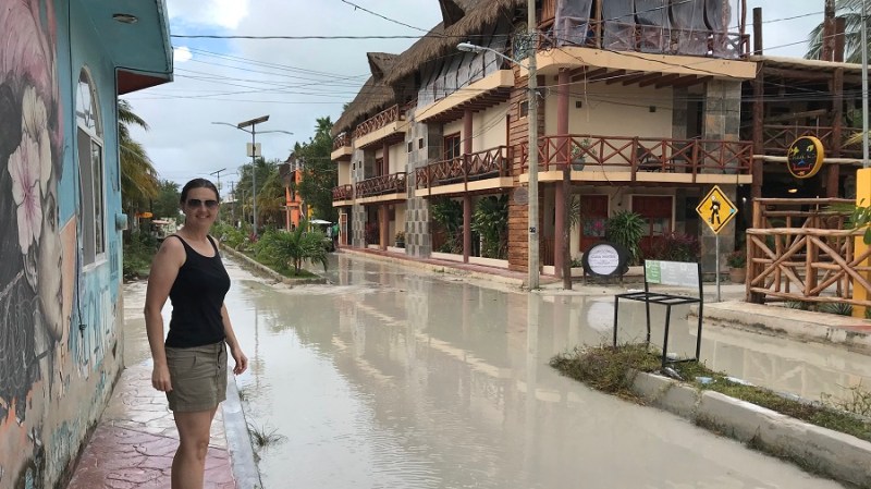 Ko sva ravno sedela ob kosilu, so se hitro nabrali gosti oblaki in kaj kmalu je nebo postalo popolnoma črno in začelo je deževati. Nevihta nas je popolnoma zajela in dež ni ponehal dobro uro. Po nevihti je najin otok postal podoben Benetkam, voda seveda ni odtekala, poti so postale reka in težko smo se premikali. Privoščila sva si dolg sprehod, kopanje v našem bazenu in mango. Ja, tudi to je rajski Holbox. Nama zelo pri srcu.