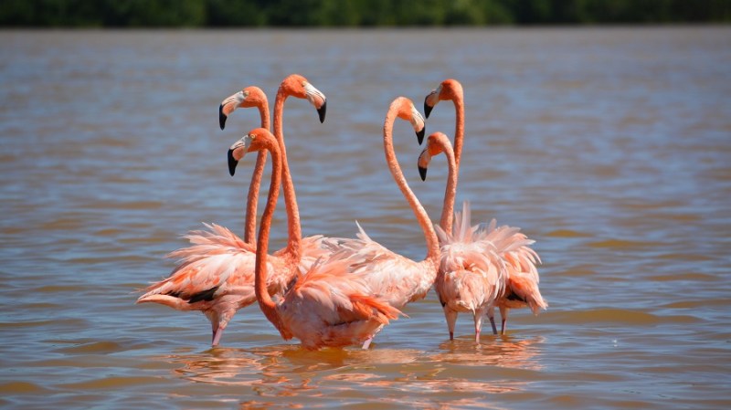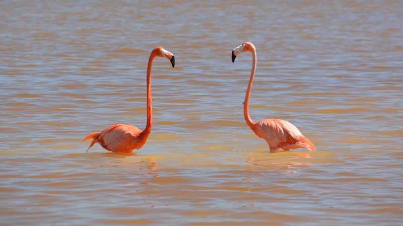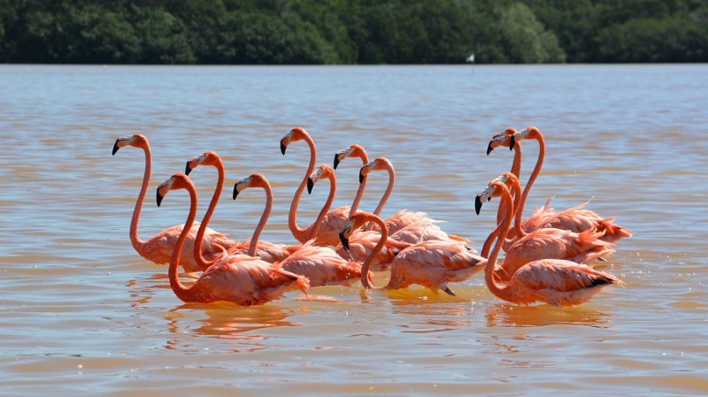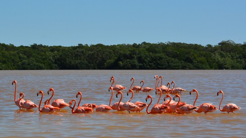 Najprej sva sicer imela v načrtu, da si greva rezervat pogledati zgodaj zjutraj naslednji dan, a sva si premislila. V vročini nisva več zdržala na plaži, nisva imela drugih ogledov, pa sva se odpeljala do reke in se odločila, da greva kar sedaj. Pri blagajni sva hitro našla par, s katerim sva si delila visoke stroške za celoten čoln in smo šli na ogled roza flamingov na reko Celestun. V rezervatu živi na stotine roza flamingov v naših zimskih mesecih, potem pa se premaknejo v Rio Lagartos med našim poletjem. Reka je tudi precej roza barve, saj v njej živi ogromno število rakcev, ki jih imajo flamingi zelo radi. Pa seveda tudi mi, zato jih tukaj domačini tudi nabirajo. Sveži škampki, njam njam. Videli smo jih res veliko število, nato pa se odpeljali še med mangrove in obiskali izvir sladke vode. Zelo lep izlet v naravi.
