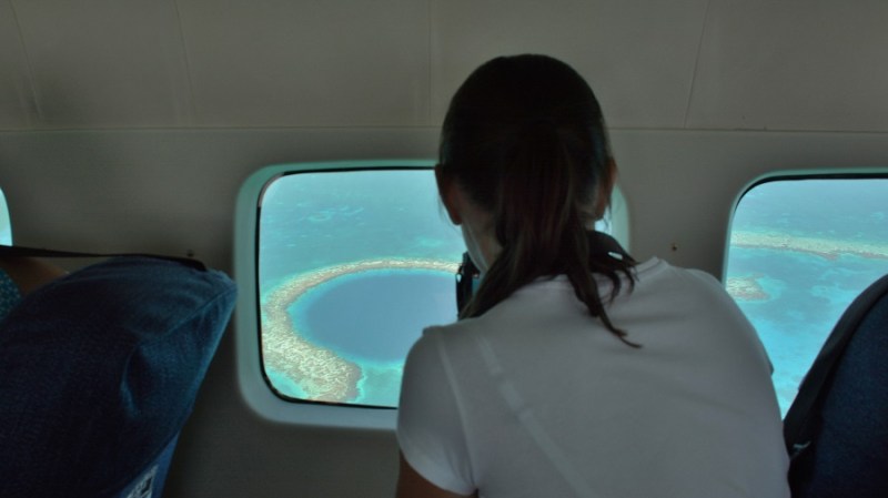 Dan, ki sem ga čakala od osnovne šole, ko sem na fotografiji prvič zagledala veličastno modro luknjo. Videti Great Blue Hole iz zraka je bila vsa ta leta moja največja želja, zato je bilo celotno potovanje v ta del sveta povezan s poletom nad modro luknjo. Zgodaj zjutraj sva se odpeljala iz San Ignacia do mestnega letališča v Belize City in nestrpno čakala na enourni polet nad Blue Hole. Letalo je bilo odlično, saj smo sedeli vsak ob svojem oknu. Leteli smo čez čudoviti Turneffe Atol, nato pa prispeli do Lighthouse Reef Atola in zagledali neprestavljivo lepo modro luknjo. Cel atol je zelo plitek in nato se voda vdre kar 124 m globoko. Največjo popolnost dodajo še korale, ki so se razmnožile v popolnem krogu. Z letalom smo naredili vsaj 10 krogov nad luknjo in čisto po pravici povem, da so mi po licu polzele solze sreče. Po povratku nazaj sva prevzela avto, ga parkirala za 4 dni pa varovanem parkirišču in se s hitrim čolnom odpeljala na otok Caye Caulker.