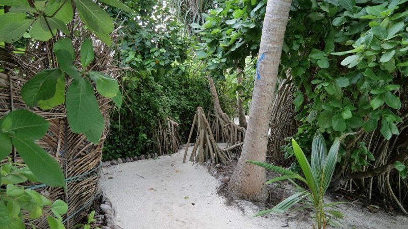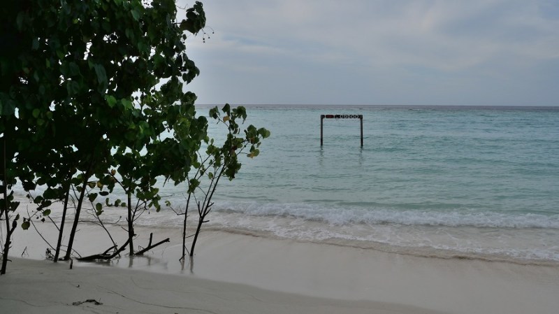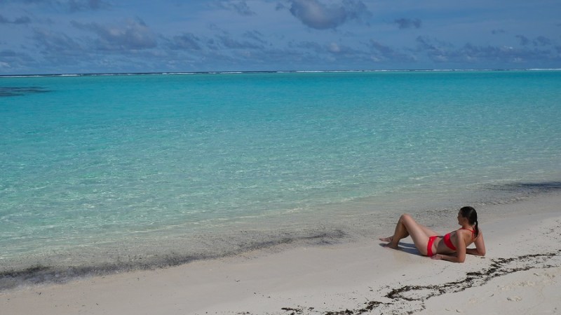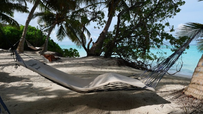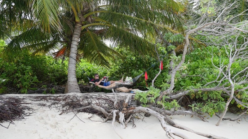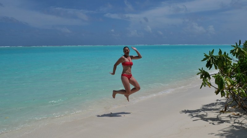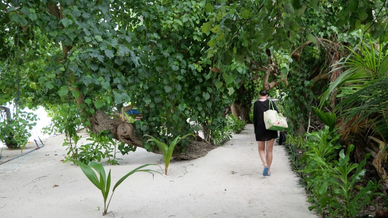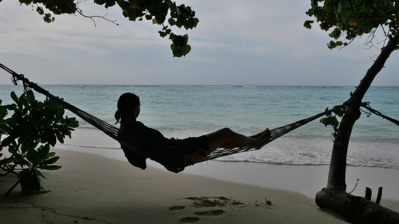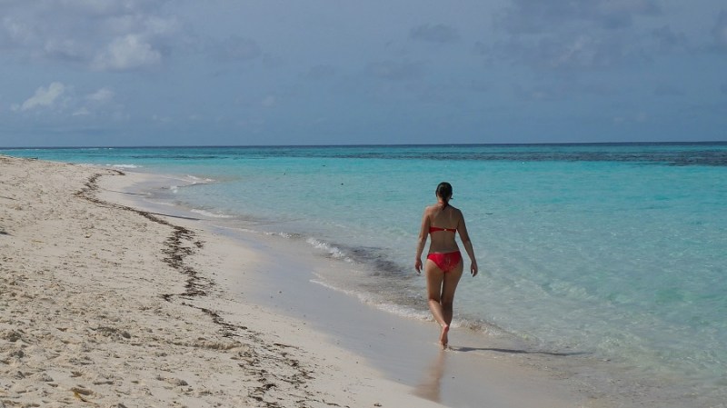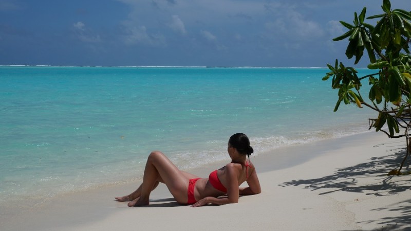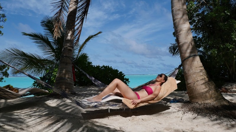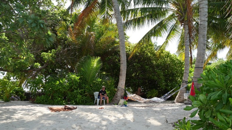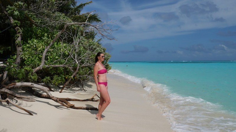 Malce po osmi uri zjutraj sva se vsak dan odpravila že na večjo bikini plažo (zahodno). Ta plaža na otoku je sicer zjutraj še v senci, a zato toliko bolj prijetna, saj ni vročega sonca. V senci pod krošnjami velikih palm so uredili počivalnike in viseče mreže, ki so seveda vse brezplačne. Ob najinem obisku nas je bilo vse skupaj na tej plaži mogoče 15, tako da je bilo prostora več kot dovolj. Precej zasebno je urejeno vse skupaj, saj je plaža razpotegnjena in ozka. Plaža ima ob oseki le dobra dva metra širine, ob plimi pa se praktično po plaži ne da sprehajati, saj se voda dvigne za en meter. Je pa do morja zelo veliko vhodov, tako da imaš lep kos morja potem le zase. Ostali obiskovalci niso bili najbolj navdušeni nad kopanjem (ne vem zakaj sicer res pridejo sploh na Maldive), saj sva bila večino časa v morju popolnoma sama. Ostalim je očitno dovolj ena slika in gremo hitro v sobo do interneta, jo takoj naložiti na splet in cel dan spremljati lajke. Ojoj! Midva pa sva uživala na plaži in predvsem ves čas v morju od 8h – 12h, nato pa od 15h – 18h. Vmes pa sva jo mahnila na kosilo in počitek. Sonce ni bilo prehudo in nisva dobila čisto nobenih opeklin (zelo zanimivo!), čeprav sva bila v morju na dan skupaj tudi po 7 ur. Uživancija, uživancija in uživancija!