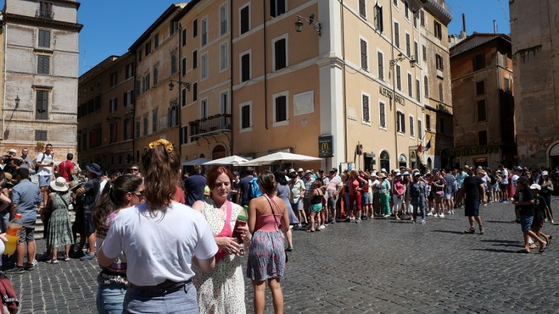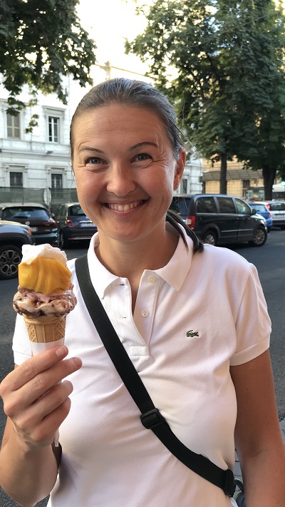 Do hotela sva se lepo sprehodila, se udobno namestila in si v sosednji ulici privoščila odlično italijansko pico ter čez cesto res pravi italijanski sladoled v slaščičarni iz leta 1947. Sladoled je bil fantastičen. Samo poglejte gnečo? In to sami domačini, ki so prihajali na sladoled celo z avtomobili. Kaj takšnega pa še ne?! Midva pa sva zavila v prvo slaščičarno in naletiva na najboljši sladoled v Rimu. Vesela!