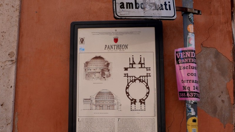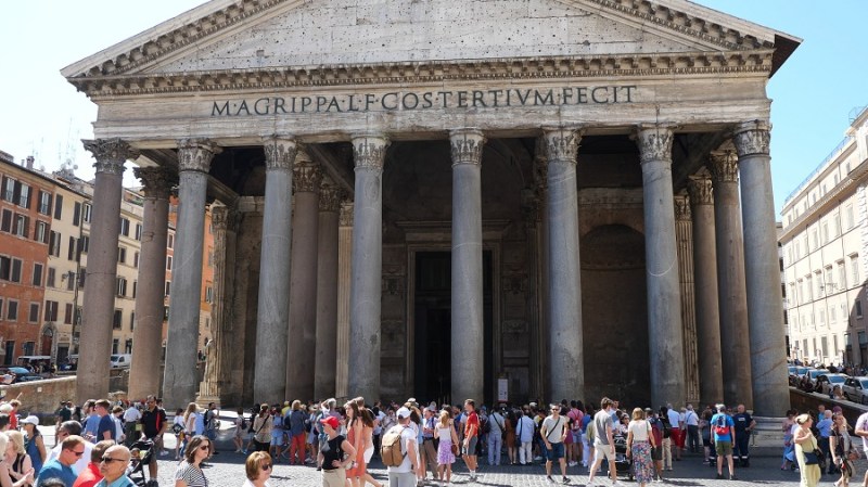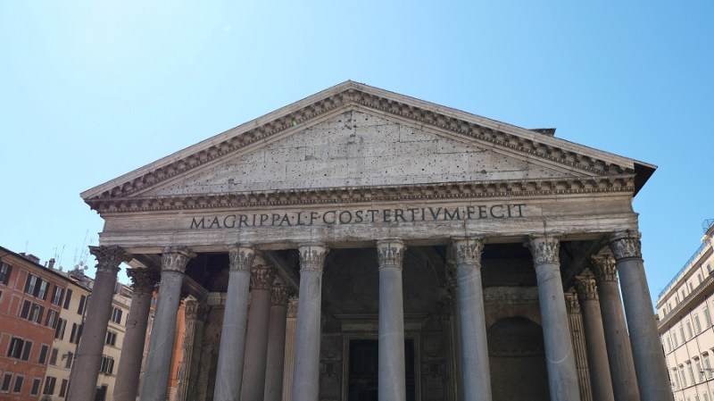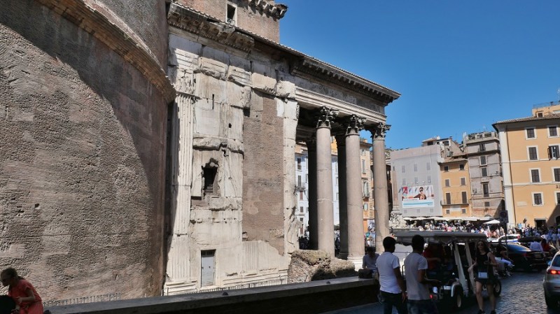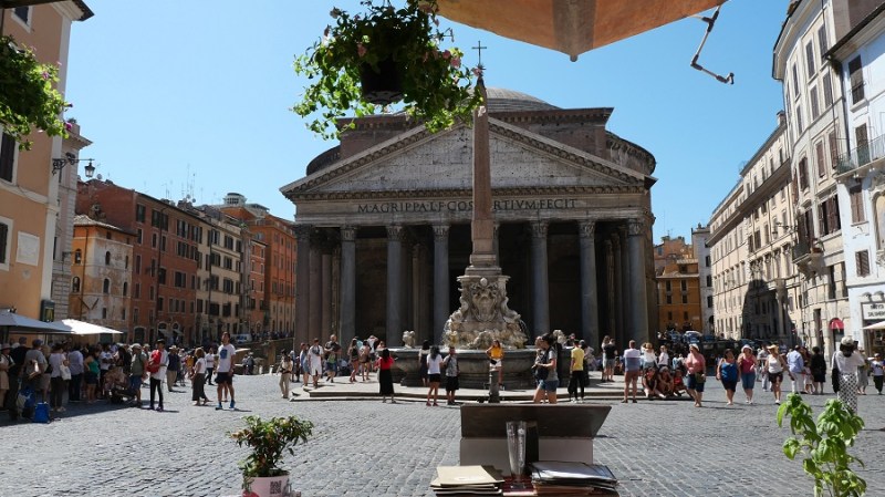Le nekaj ulic stran se nahaja sloviti Panteon, ki ga vsi dobro poznamo iz kulis Rima. Panteon ali “tempelj vseh bogov” je nekdanji rimski tempelj in dandanes cerkev. Postavljen je na mestu starejšega templja, ki ga je naročil zgraditi Mark Agripa v času vladanja cesarja Avgusta in sicer že 27. st. pr. n. št. Dokončal ga je cesar Hadrijan in posvetil leta 126. Le-ta je obdržal napis starega templja, ki je pogorel. Okrogla stavba s portikom velikih granitnih korintskih stebrov pod pedimentom. Ob vstopu vas čaka pravokotno predverje, nato pa vstopite v okroglo dvorano z prečudovito betonsko kupola in osrednjo odprtino (okulus). Skoraj dva tisoč let po tem, ko je bila zgrajena, je Panteonova kupola še vedno največja nearmirana betonska kupola na svetu. Višina okulusa in premer notranjega kroga sta enaka in merita 43 metrov. Velja za eno najbolj ohranjenih starih rimskih stavb, predvsem zato, ker je bila v svoji zgodovini stalno v uporabi. Od 7. stoletja dalje je Panteon služil kot cerkev in tako je še dandanes.