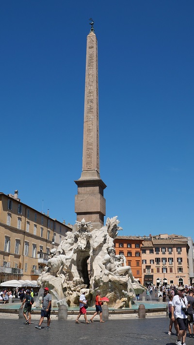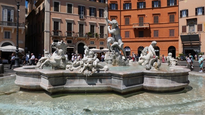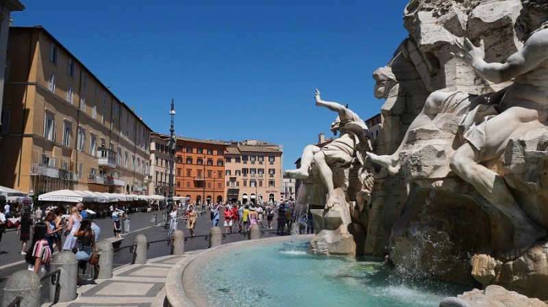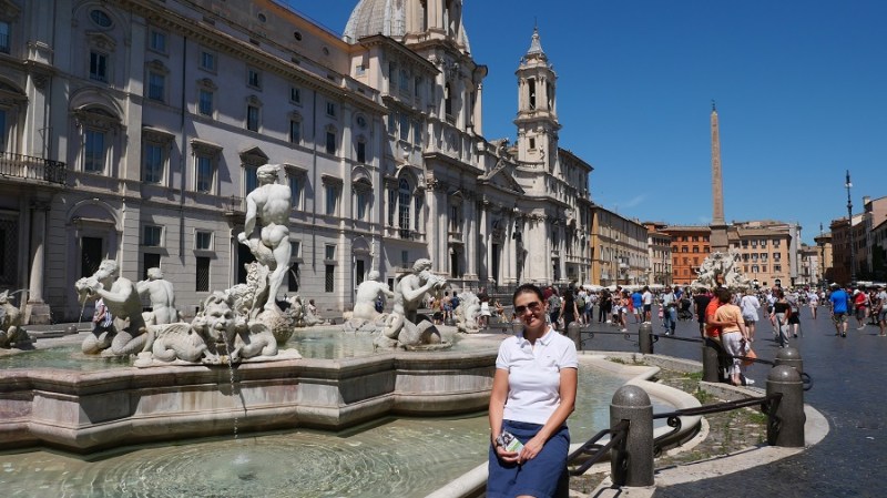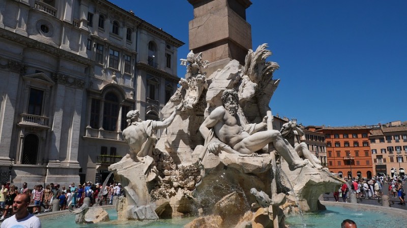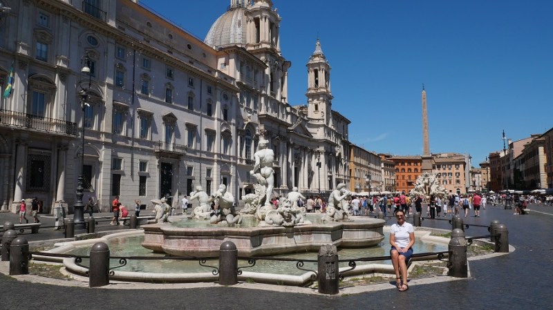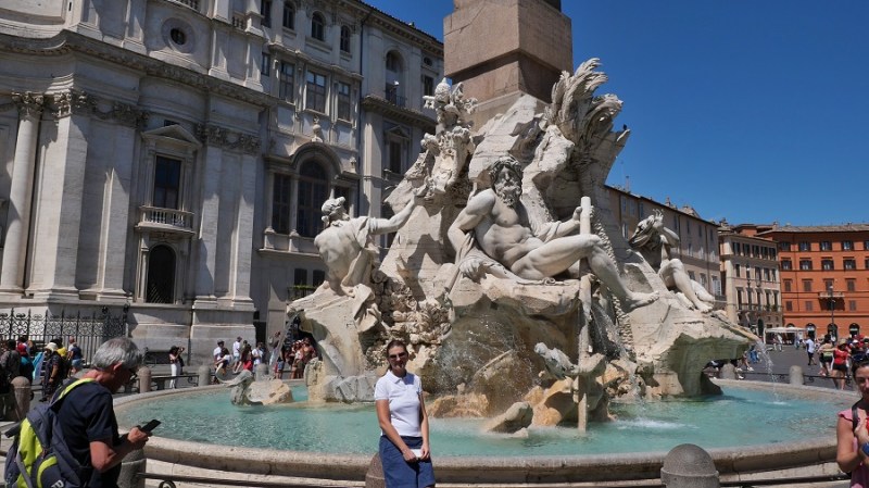 Po kosilu sva nadaljevala do trga Navona, ki ga je oblikoval Bernini v slogu starorimskega hipodroma, ki se je nahajal na tem mestu v preteklosti. V času antičnega rima je na tem mestu stal stadion, ki je bil zgrajen leta 85. Stadion je lahko sprejel kar 30.000 gledalcev. Dandanes na trgu stojijo trije čudoviti vodnjaki, ki vabijo poglede. Na sredini je vodnjak štirih rek (Fontana del Quattro Fiumi), ki je bila zgrajena leta 1651.