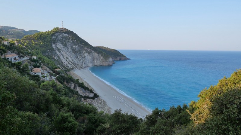 Na otoku Lefkada (Lefkas) je nekaj prečudovitih plaž. Vse se nahajajo na zahodnem delu otoka, tako da skrbno izberite svoje prenočišče. Midva sva imela tri nočitve v apartmaju, ki je bil oddaljen 10 minut peš od vasice Agios Nikitas in približno 30 minut peš čez hrib do najlepše peščene plaže Milos. Zjutraj sva si kupila jabolčne zavitke v sosednji pekarni in se zgodaj odpravila peš na plažo. Do plaže Milos lahko pridete le po tej poti, ki je čez hrib po gozdni poti, za katero priporočam vsaj Teva natikače ali celo superge. V navadnik japonkah gre zelo težko in lahko si zvijete gleženj, saj je precej strma in mivkasta. Druga možnost je čoln is vasi Agios Nikitas, a prvi pelje šele ob 10. uri. Kot običajno sva bila med prvimi obiskovalci in uživala v miru čudovitega zaliva, prvih sončnih žarkov ter turkiznem toplem morju. Enostavno prekrasno. Seveda so kasneje začeli prihajati obiskovalci, a še vedno je bila precej znosno in tudi ne hrupno, saj na plaži razen res mini kafiča ni nobene druge ponudbe. Rajsko!