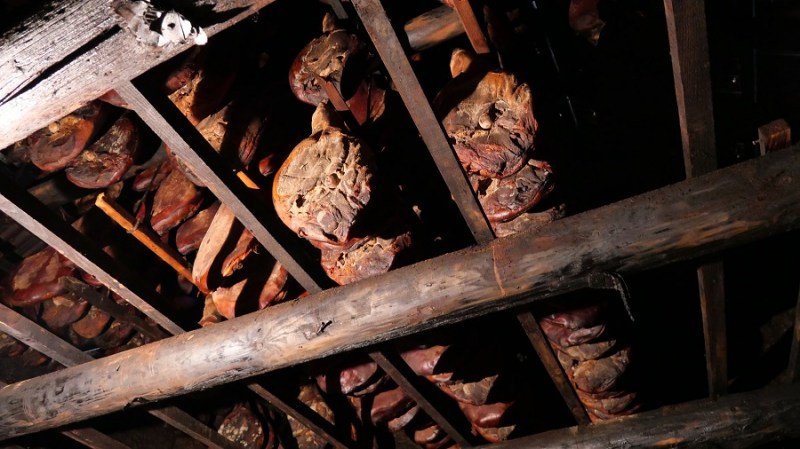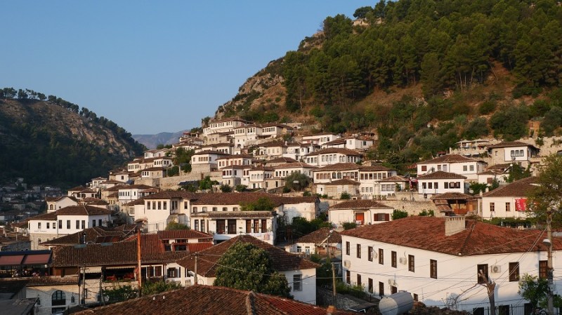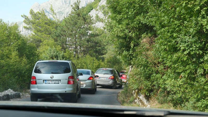 V najini nastanitvi nama je gospodarica Mira pripravila zjutraj odličen zajtrk. Še zadnji pogledi na čudovite hiše, nato pa na dolgo pot. Čez Albanijo sva se peljala popolnoma brez težav in tudi zelo hitro. Na črnogorski meji pa so naju zadrževali kar eno uro, ker je gospod preverjal najine številke šasije v bazi, če nimava slučajno ukradenega avtomobila. Pa kdo bi v Albaniji sploh hotel voziti BMW, če je 90% avtomobilov znamke Mercedes. Brez heca. Midva sva se krohotala, on pa je z veliko resnostjo opravljal svoj posel. Ustavila sva se v lepi majhni vasici Njegoši, kjer na planoti sušijo pršut. Ustavila sva se v garaži, kjer nama je gospodar narezal domači sir in pršut. Domačo kajsijo sva prijazno zavrnila, a sva jo kupila za domov eno steklenico. Gospodar je priznal, da je meso madžarskega porekla, a da vseeno kupujejo zelo dobro meso za sušenje. Pokazal nama je tudi svojo pršutarno, kjer je na stropu viselo precejšnje število nog.