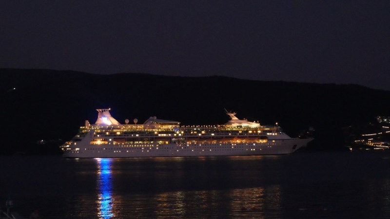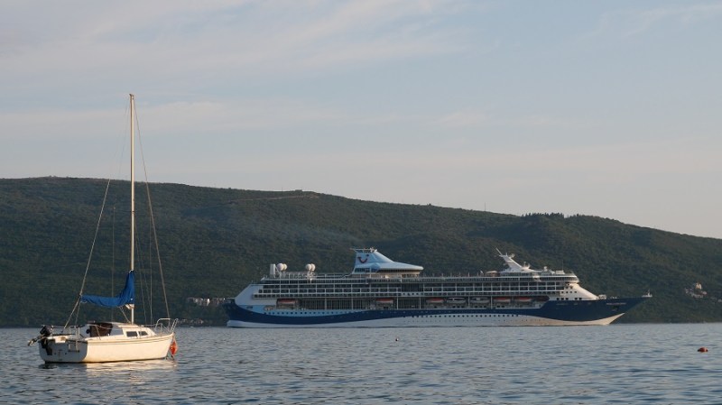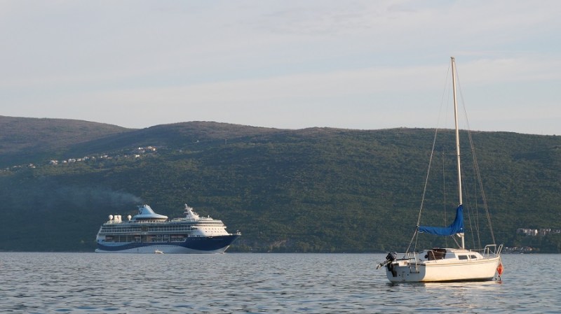 V obalno mesto Herceg Novi sva prišla okrog 16. ure popoldan in izkoristila nekaj svetlih ur še za hitro kopanje v toplem morju čez cesto najinega prekrasnega hotela. Nato pa na dolg sprehod po rivieri ob polni Luni še na palačinke. Križarki sta ravnokar zapuščali zaliv.