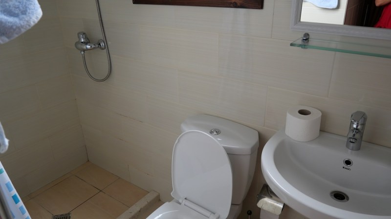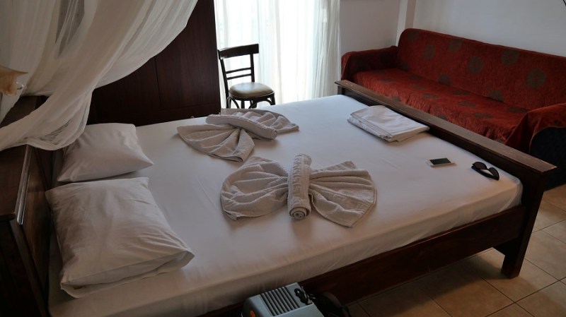 Na Lefkadi sva izbrala dobro lokacijo in sicer vas Agios Nikitas, kjer je pa zelo malo prostora in zelo malo nastanitev z parkiriščem. Zato sva izbrala nastanitev malce ven, da sva imela parkirišče ter malce več miru. Sicer je nastanitev manjša, z dotrajanimi sobami in dotrajano kopalnico. Manjša terasa pa vam nudi malce razgleda na obalo. Sva bila zadovoljna, ni pa bila noben presežek v bivanju.